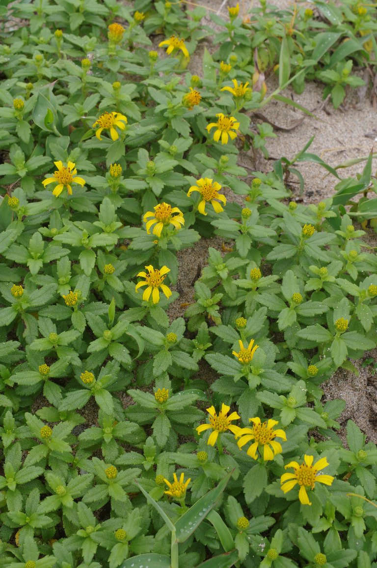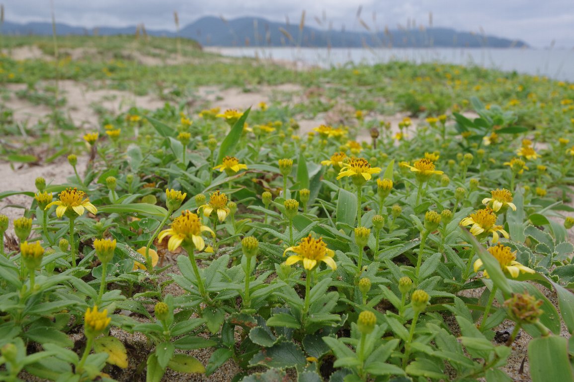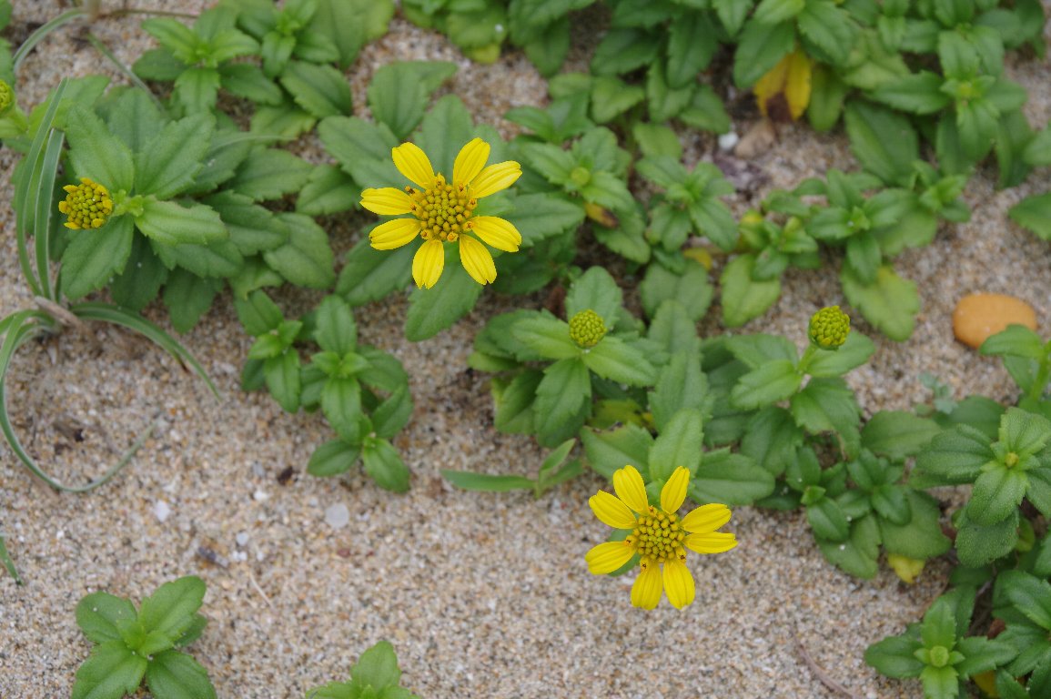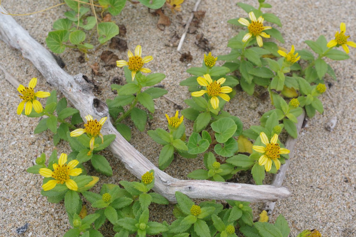 どよんとした曇り空だが、それでも、7月の海岸は暑い。 砂浜を歩くと、ネコノシタの黄色い花があちこちに咲いていた。 やや強引だが、流木や海を入れて、海岸植物らしく撮ってみた。 |