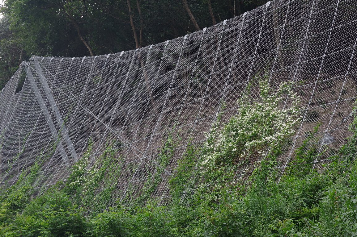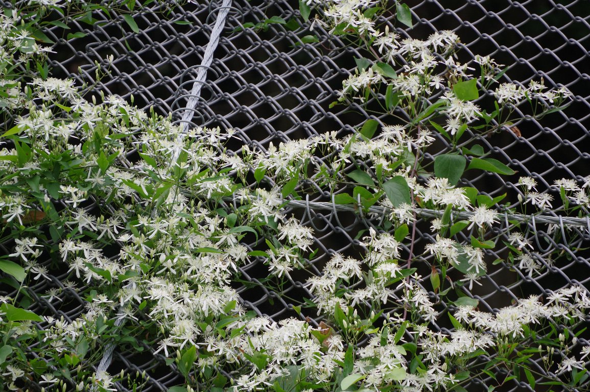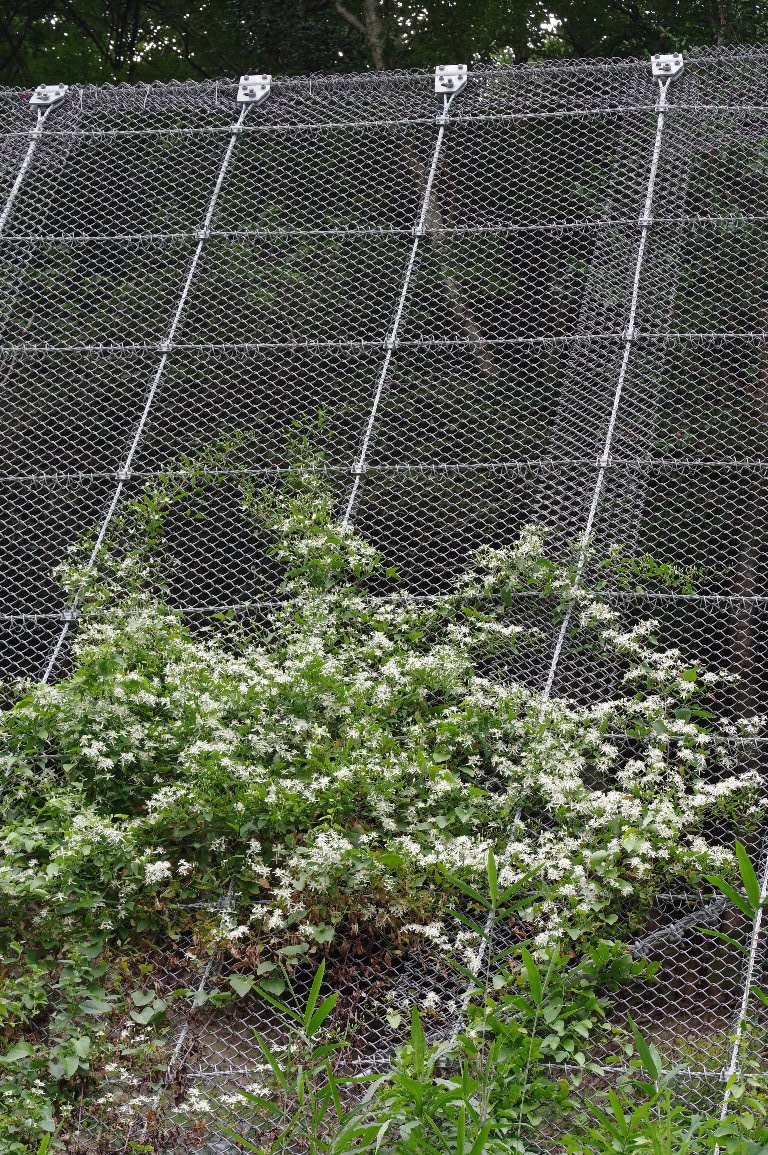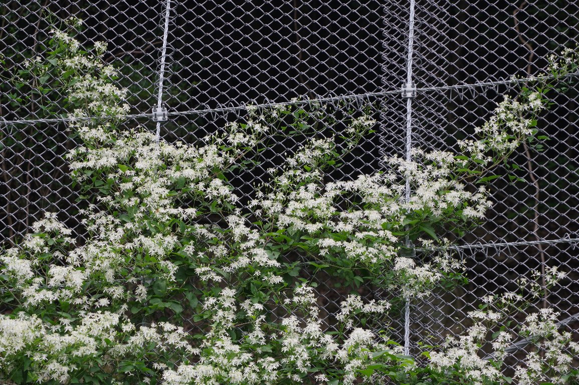 工事が終わったばかりの、道路に面した崩落防止フェンス。 いち早く絡みついているのはつる草のセンニンソウだ。 ぐんぐん登っていって、誇らしげに、たくさんの白い花を咲かせていた。 |