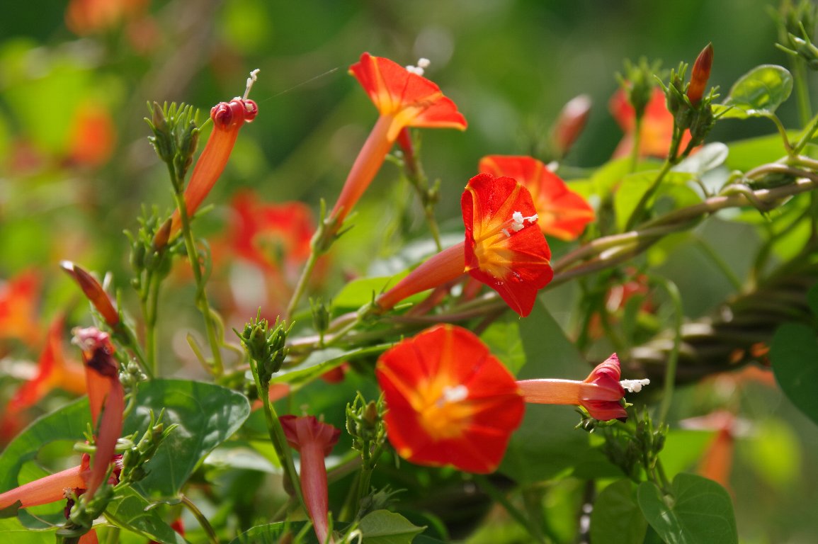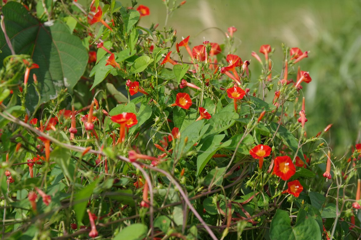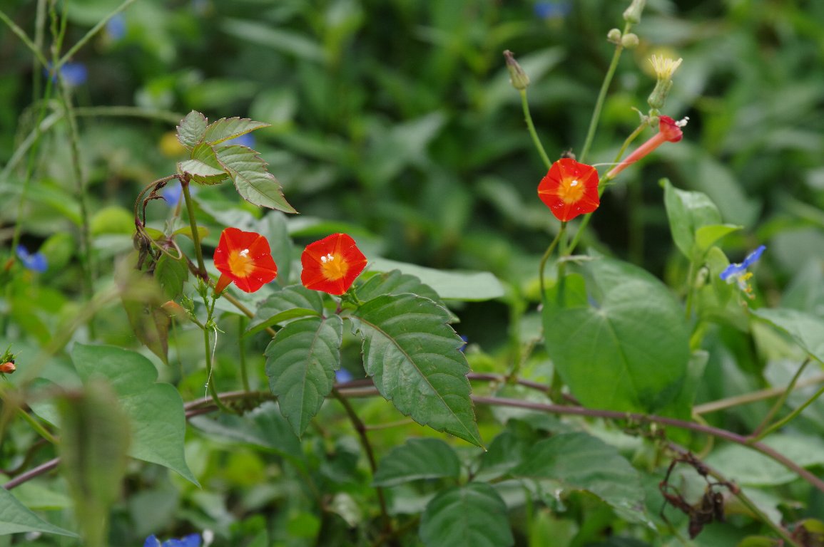 秋の花のシーズンを迎え、田んぼのあぜ道も、ところどころ花が目につくようになる。 ごちゃっとつる草が絡まった一角で、マルバルコウが、鮮やかな朱色の花を幾つも咲かせていた。 |