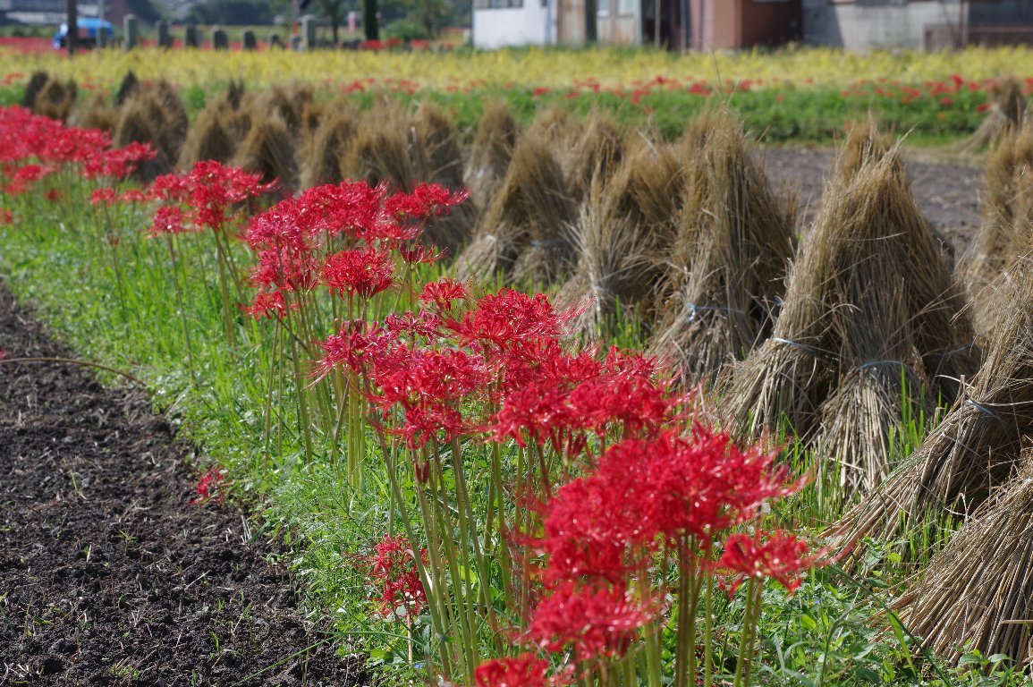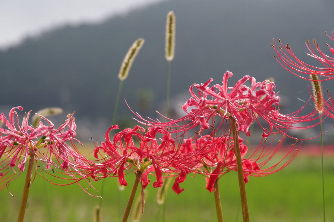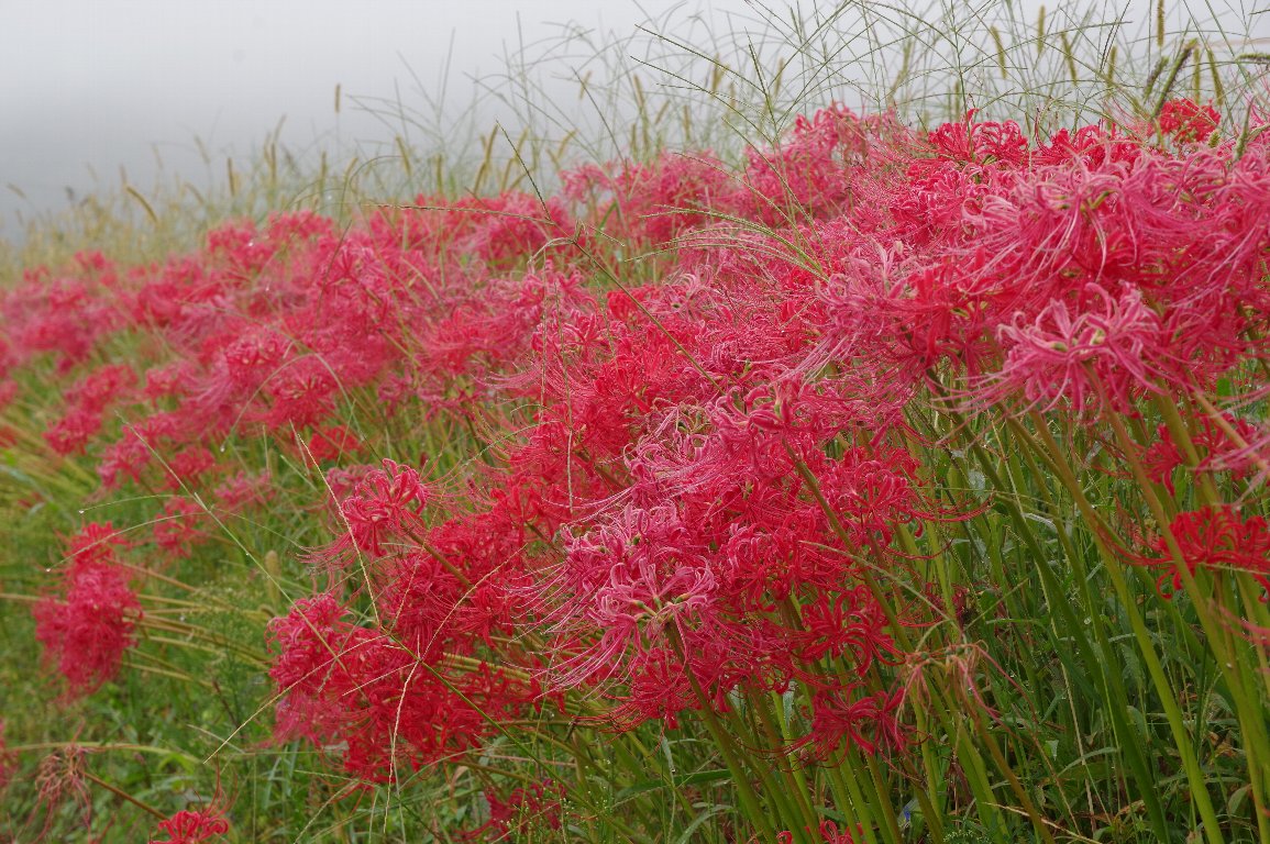 撮影雑記: 「花の二十四節気」は、基本的には前年に撮った写真を掲載するのですが、2017年、2018年と ヒガンバナの掲載が続いたので、2018年に撮った亀岡のヒガンバナの掲載を見合わせていました。 さすがにそろそろ載せないと、古くなってしまうので、2021年の「秋分」に載せました。 亀岡のヒガンバナの名所は、2016年(2017年掲載)にも訪れているのですが、群生地とは ちがう田んぼで撮っていました(帰りしなに気づいたのですが)。 改めて訪れた亀岡の自生地。 今回は、まちがえずに、群生する田んぼに行きました。 朝早くに着いたところ、朝霧が一面に出ていました。 群生するヒガンバナも、しっとりと濡れています。 ![]() あまりに密集していると、面白味のない写真になりがちです。 いろいろ角度を変えて、撮ってみました。 ![]() 霧が晴れ、日差しが射し始めてきました。 エノコログサとのコラボショット。 ![]() こちらは、エノコログサが主役。 ヒガンバナの赤が、彩りを添えます。 ![]() 脱穀の終わった稲束に、寄り添うように咲くヒガンバナ。 この稲束は、やがて、鋤き込まれて、あるいは、焼かれて、肥料になるのでしょうね。 ![]() |