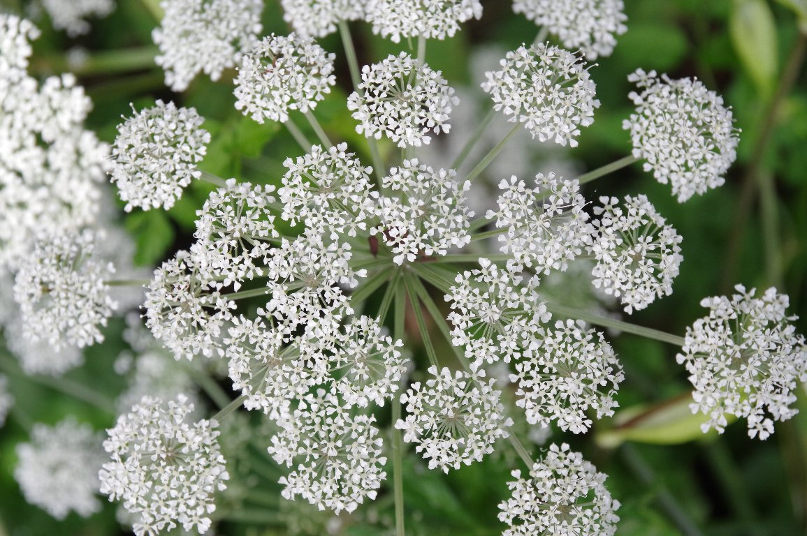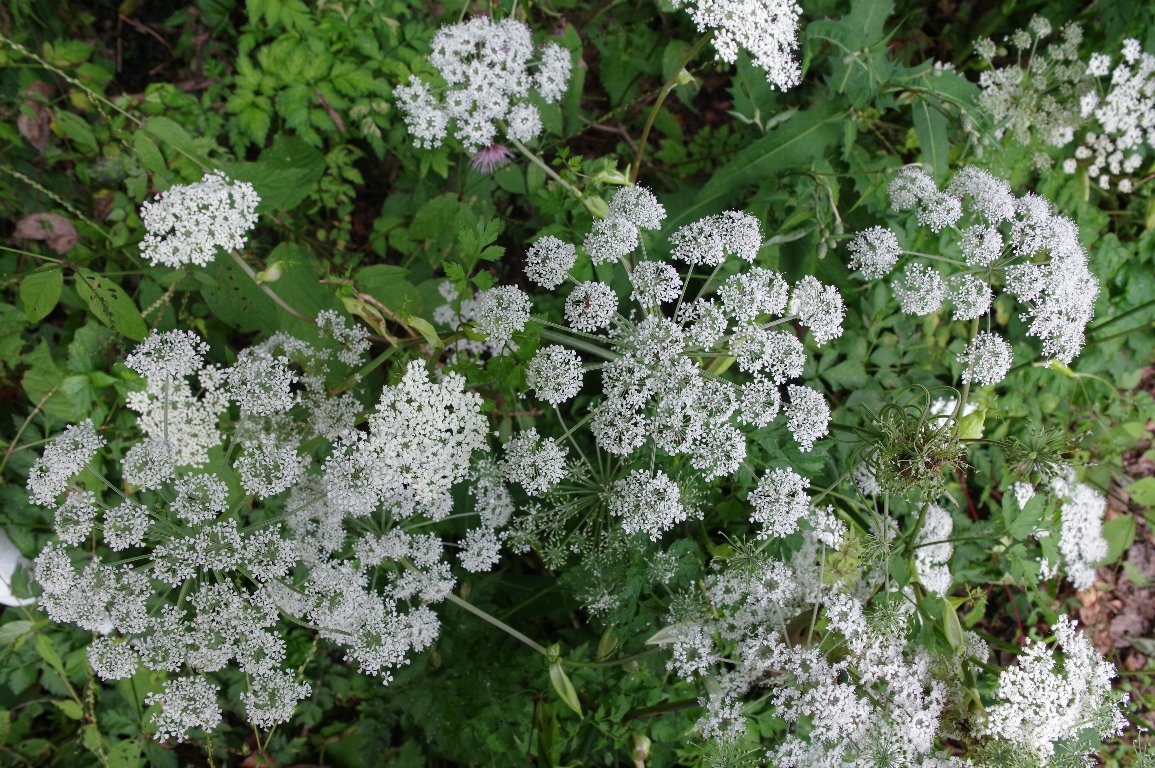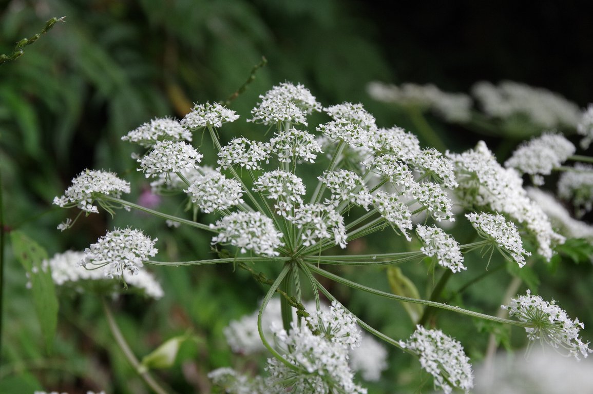 三瓶山からの帰り、ちょっとルートを変えて、あまり通ったことのない山道を通った。 すると、道端に、白いセリの花が満開だった。 パッと開いた花火のような花。おそらく、シラネセンキュウだろう。 |