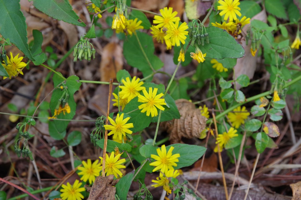 晩秋の野山を飾る黄色い花のヤクシソウは、つぼみが下を向いて、全体がうなだれて