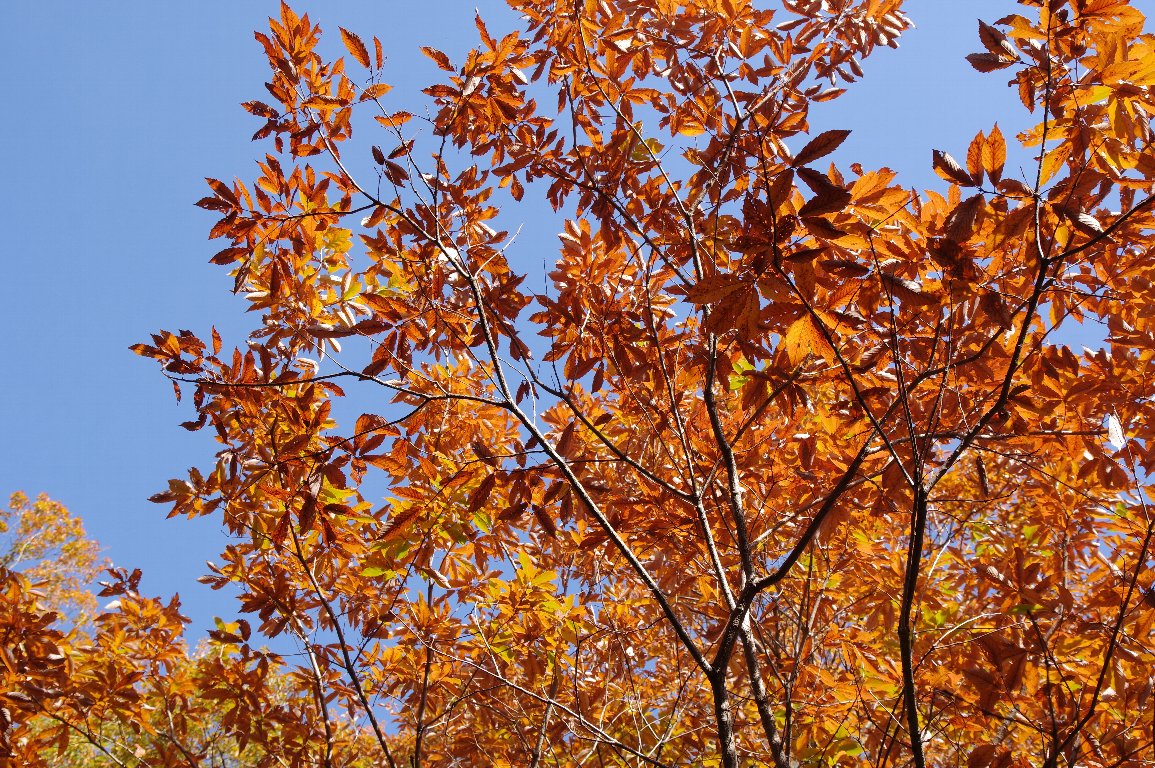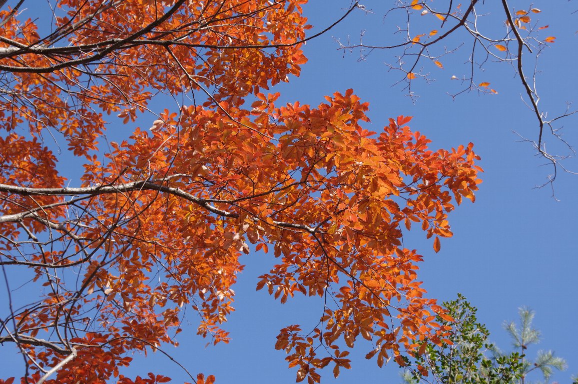 目が覚めるようなオレンジ色の紅葉。 この、背びれのような不思議な樹形は、伐採した株から伸びた枝が大きくなった? コロナ禍で近所の山を巡ったが、思いがけない出会いがあるものだ。 |