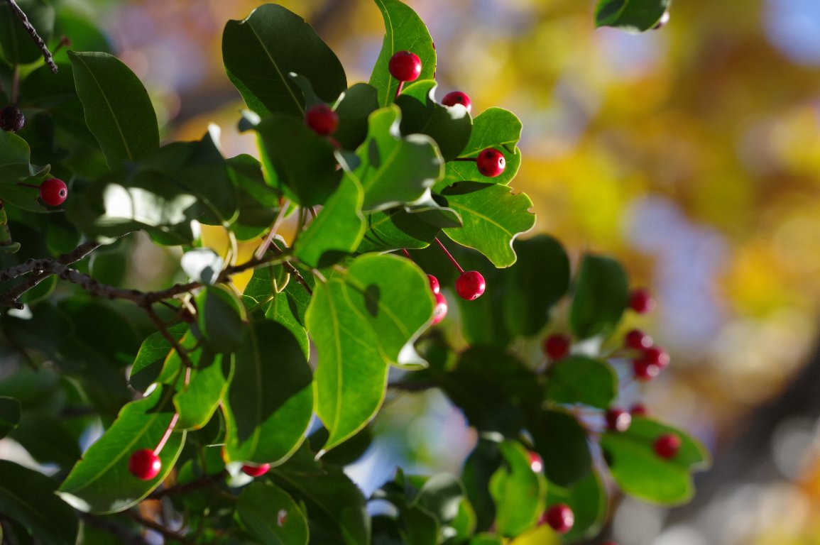 たくさんの赤い実をつけたソヨゴ。こんなに生っているのは、久しぶりに見た。 常緑の厚手の葉っぱも日に透けていて、緑と赤のコントラストがとてもきれいだった。 |