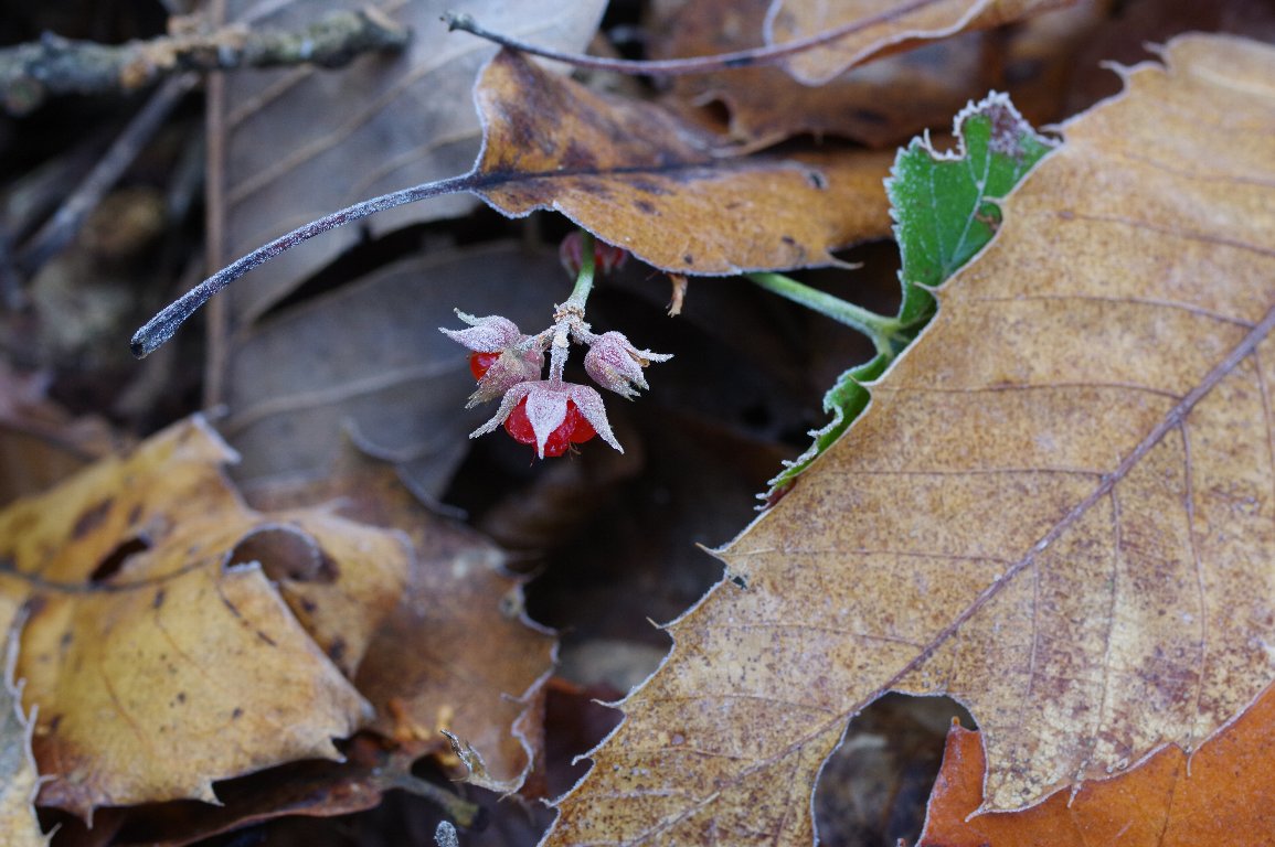 撮影雑記: 上に書いたとおり、冬に実るフユイチゴに霜が降りたらどんなだろう?って思って、 以前に実が生っているのを見つけたフユイチゴのある場所に行ってみました。 ありました。 林の下だったせいでしょう、かなり薄い霜でした。 ![]() 思ったより、イチゴの実が少なかったです。 でも、落ち葉の間からちらっと除く姿が、何とも言えません。 ![]() 近づいて、下から見上げてみました。 ![]() ほんとに、ほのかな淡い霜です。 ![]() 最初、淡い霜に、ちょっと残念な気がしたのですが、撮っているうちに、この淡い霜が、返って、 美しいなと思いました。 |