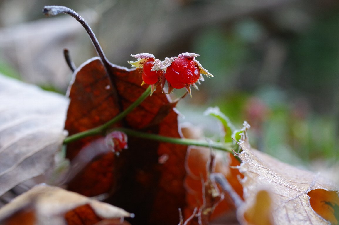 冬の野に、赤く実るフユイチゴ。 ふと、霜の降りたフユイチゴってどんな様子だろう?と思って、以前に見つけた 場所に行ってみた。 そこには、粉砂糖を振りかけたような、おいしそうな苺があった。 |