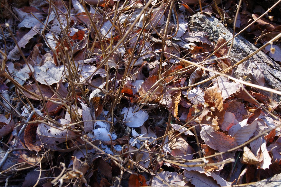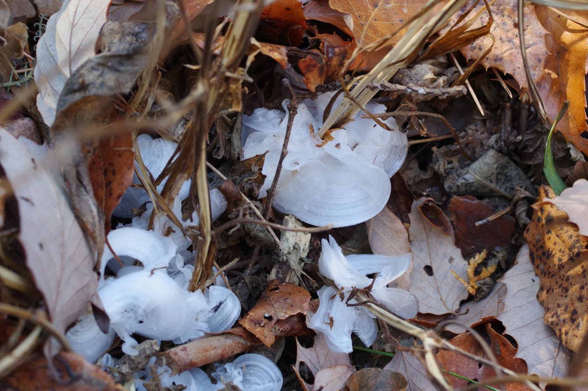 ぐんと冷え込んだ、1月の朝。アキチョウジの花が群生していた場所に向かう。 果たして、霜柱はできているのか?寒すぎで何もないのでは? あった!小さな、小さな、氷の芸術が、射し始めた朝日に輝いていた。 |