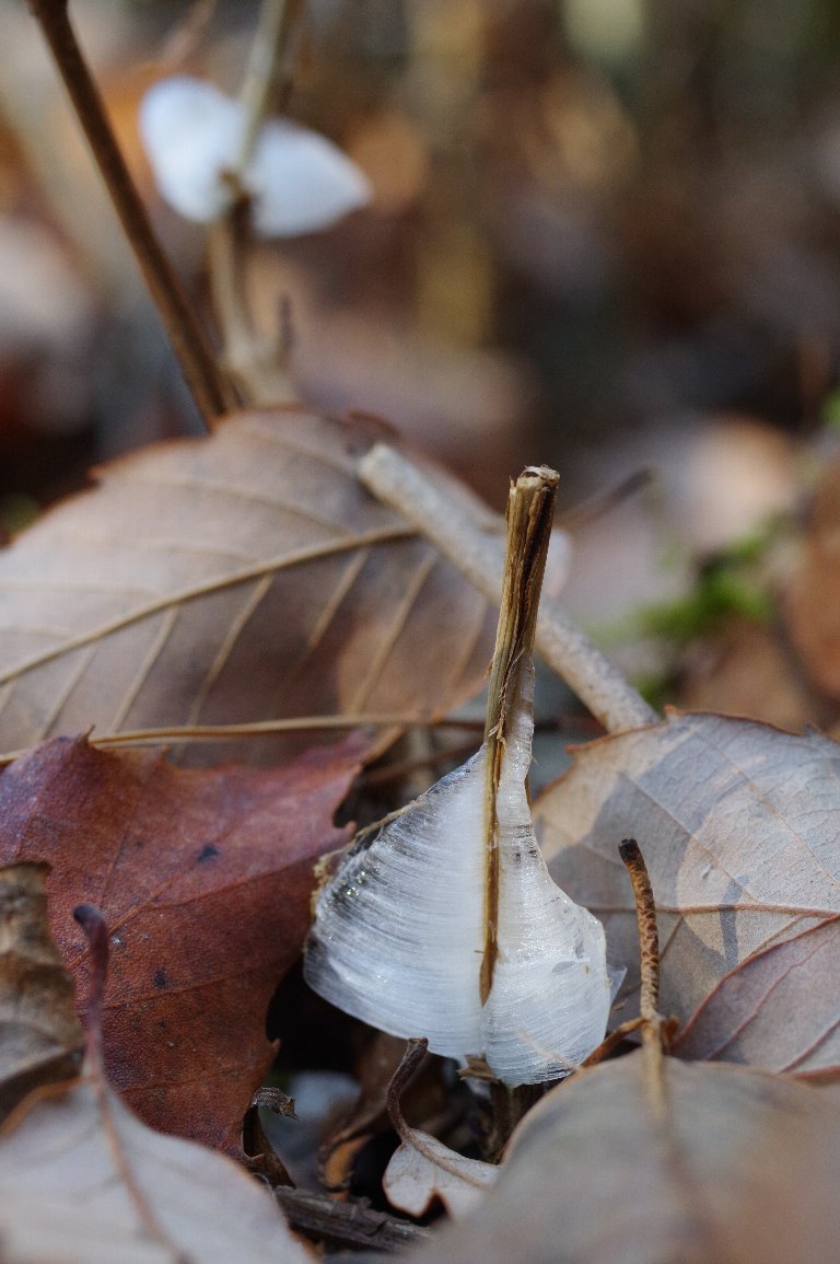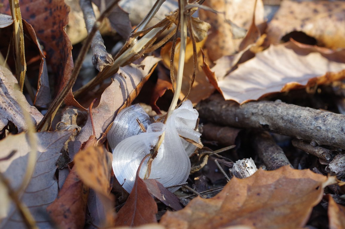撮影雑記: 冬枯れした草の茎の根元に、毛細管現象で吸い上げられた水が凍って、薄氷が張る ことがあります。これを霜柱と呼びます(地面にできる霜柱と同じ言葉ですが、別物です)。 植物の種類によって、霜柱ができやすい種類とそうでない種類がありますが、できやすい 種類で一番有名なのは、その名もシモバシラという植物です。 ちなみに、シモバシラの名の由来は、文字通り霜柱ができやすいからという説と、 細かい白い花が立ちあがって咲く様子が霜柱を連想させるからと言う説とあります。 さて、残念ながら、シモバシラは関西には分布が少ないのでしょうか、関西では 自生を見たことがありません。なので、シモバシラの霜柱は見たことがありません。 でも、霜柱ができやすい植物にアキチョウジがあります。アキチョウジは、関西の あちこちで自生しており、アキチョウジにできた霜柱は、3回ほど見たことがあります。 でも、霜柱は、冬の寒い朝を狙って、見に行こうと思わないと見られませんので、 ここ何年かは、見ていませんでした。 近所の里山公園の谷筋の一角に、アキチョウジが群生しているのには数年前から 気づいていたので、とびきり冷えた冬の朝、がんばって行ってみました。 気温は−5℃ほどに冷えています。 こんなに冷えてしまうと、茎に水が上がって来ず、何にもないのではないか? そんな気持ちになりながら、群生していた場所に着いてみると…。 おお! ありました、できていました、たくさんの霜柱が! ![]() ひとつひとつ、形がちがいます。 こちらは、リボンをひねったような形。 ![]() 林の隙間から、遅い朝日が射し始めましたが、あまりに気温が低いので、なかなか 融けません!おかげで、霜柱がキラキラ輝いた写真が撮れました。 こちらは、扇形に広がった形。 トップの写真と同じ霜柱を縦構図で撮ったものです。バックに、ちょうちょの ように広がった霜柱も写っています。 ![]() 写真だけ見ると、硬そうな氷に見えますが、ちょんとつつくだけで壊れてしまうほど、 薄くて繊細な氷です。 少し退いて撮った写真。 落ち葉の間に、埋もれるように霜柱ができているのがわかります。 ![]() わずか2cmにも満たないような、小さな氷の芸術。 寒さも忘れて、久しぶりに、美しい霜柱を堪能した朝でした。 |