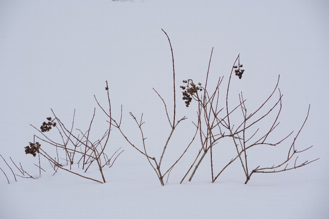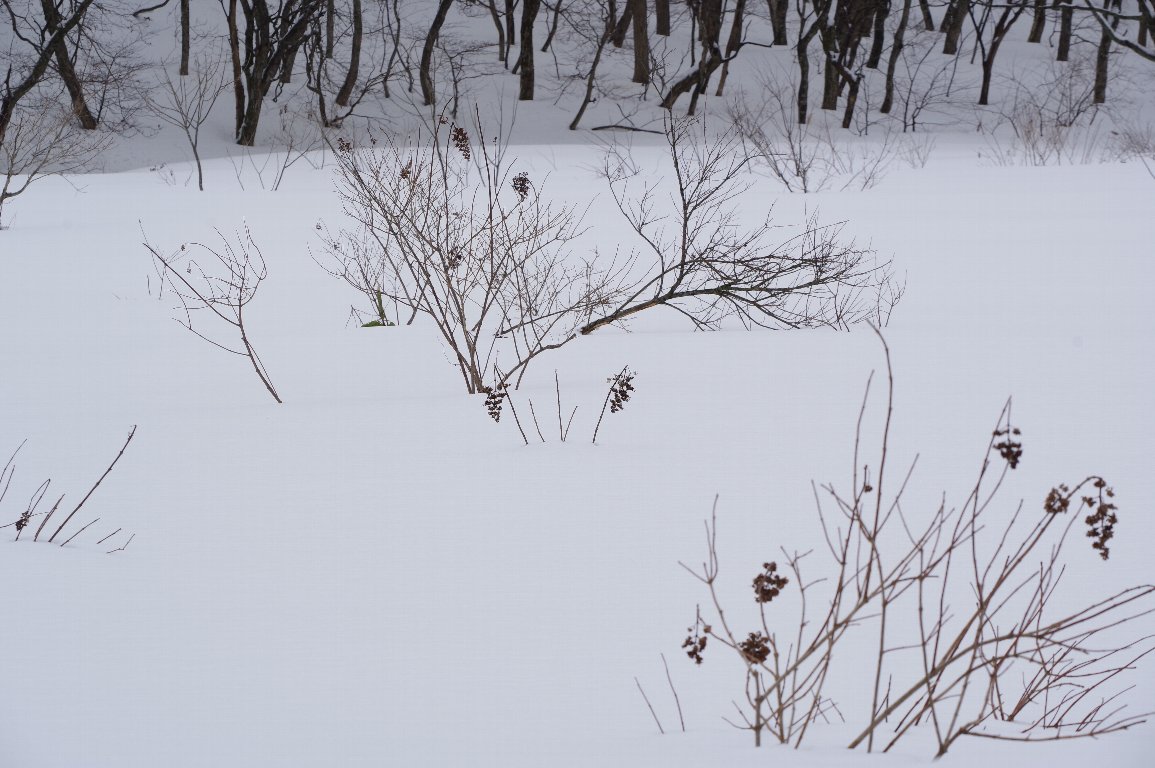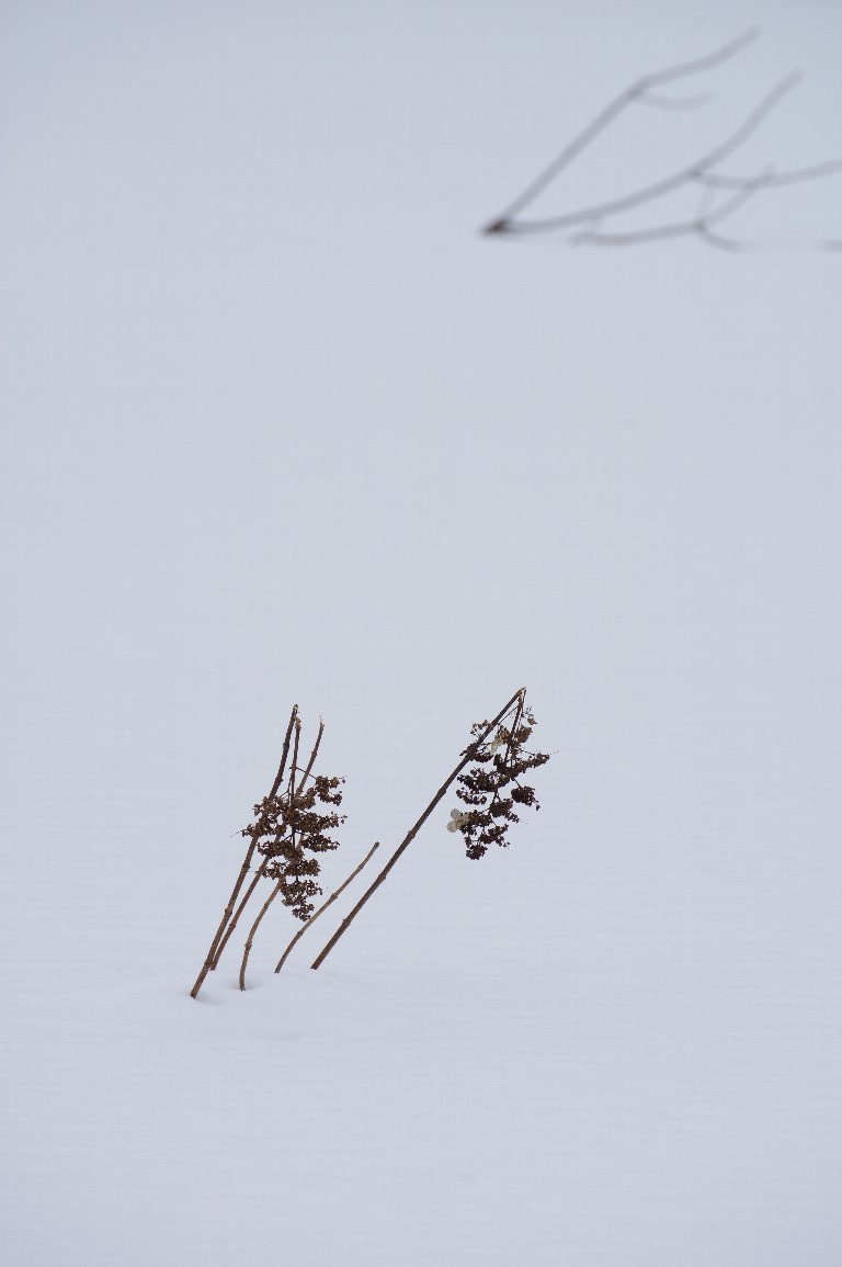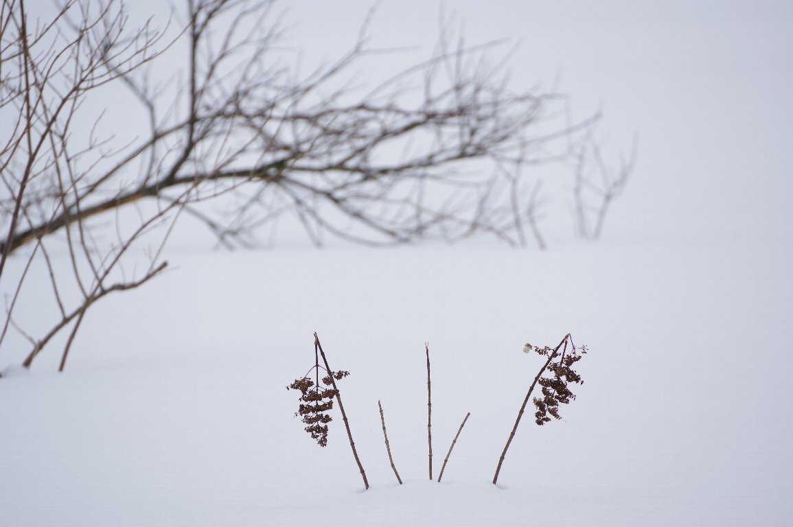 撮影雑記: 真冬の丹後半島を訪れるのは、数年に一度です。 丹後の山中はいつも雪に覆われていますが、この年も、すっぽりと白い雪に覆われていました。 湿地もすっかり雪の下。 わずかに、ノリウツギの枝や枯れ残った花だけが、顔を出しています。 ![]() なかなか趣のある姿に、撮影心が高まります。 ![]() いろいろな切り取り方をしました。 こちらは、背景の林の根元だけ少し入れて撮ってみました。 ![]() 背景の木々をぎりぎり入れて撮ってみたのが、冒頭の写真です。 さらに、思い切って、大胆に切り取ってもみました。 ![]() どれも、雪国の人から見れば、見慣れた、ありふれた光景かもしれませんが、私には、とても素敵な 姿ばかりでした。 |