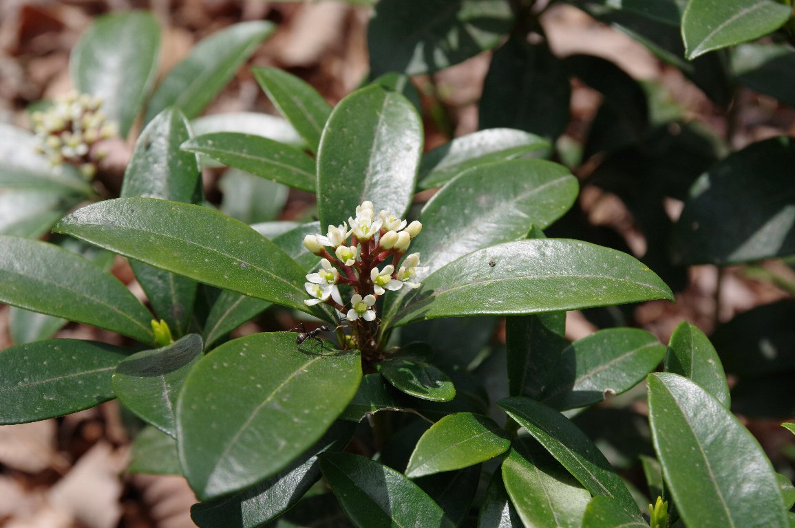 道なき雑木林を歩いていると、丸く広がった葉っぱのてっぺんに花をつけた、小低木があった。 ミヤマシキミの花だ。地味な花だが、一目でそれとわかる特徴がある。 |