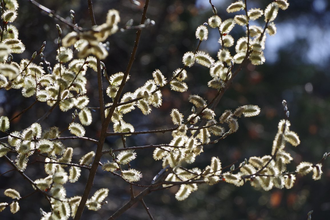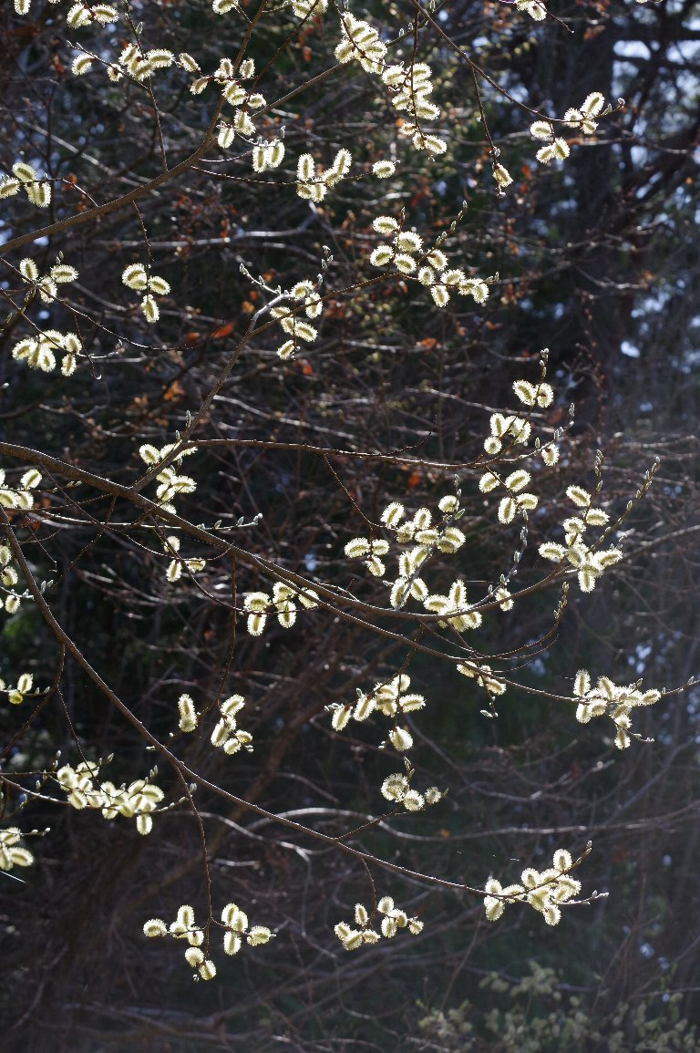 ヤナギの見分けは難しいが、おそらく、バッコヤナギと思う。 輝いている花はとてもきれい。でも、なんだか、虫がいっぱい舞っているようにも見える。 |