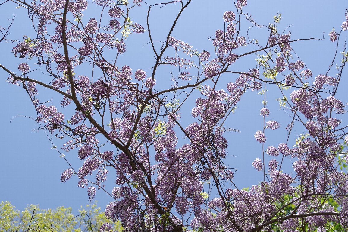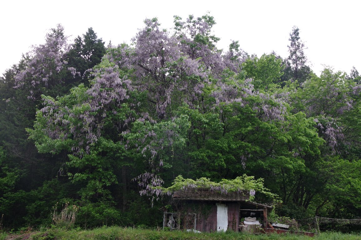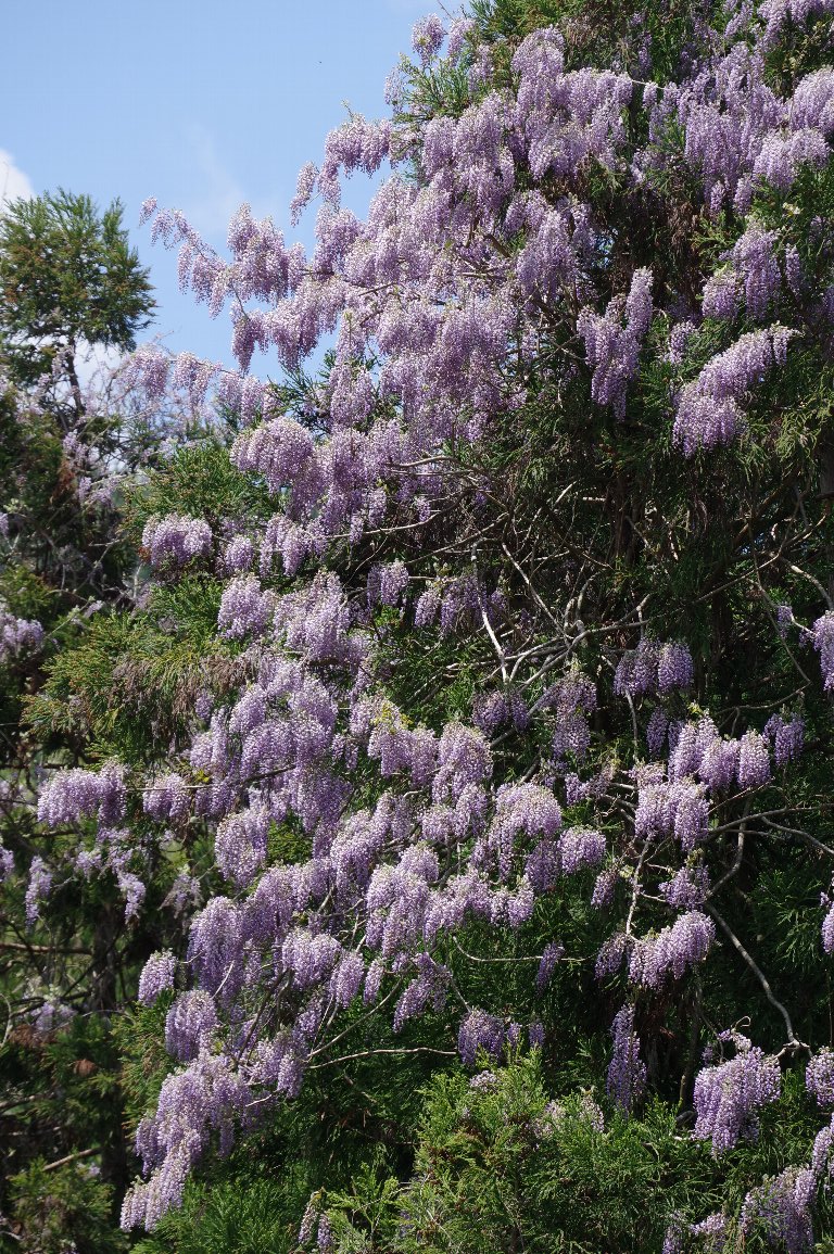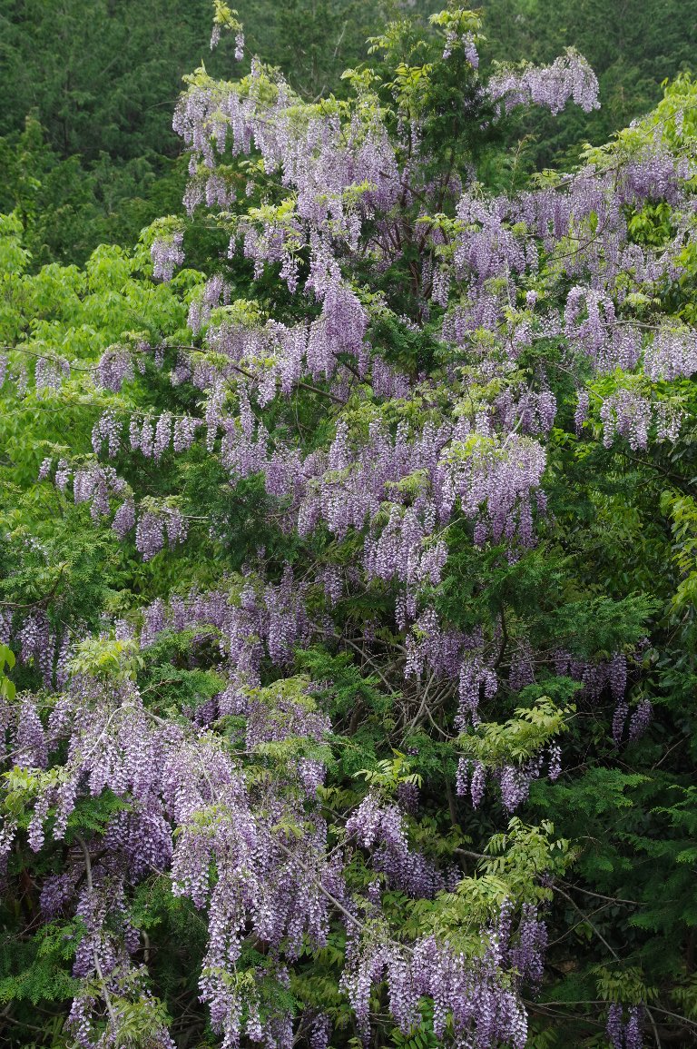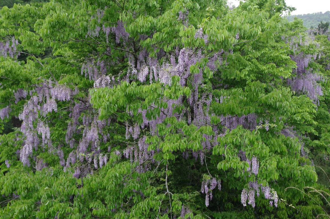 里山から山間の道路を車で走っていると、大木に絡んで見事に花を咲かせたフジが、