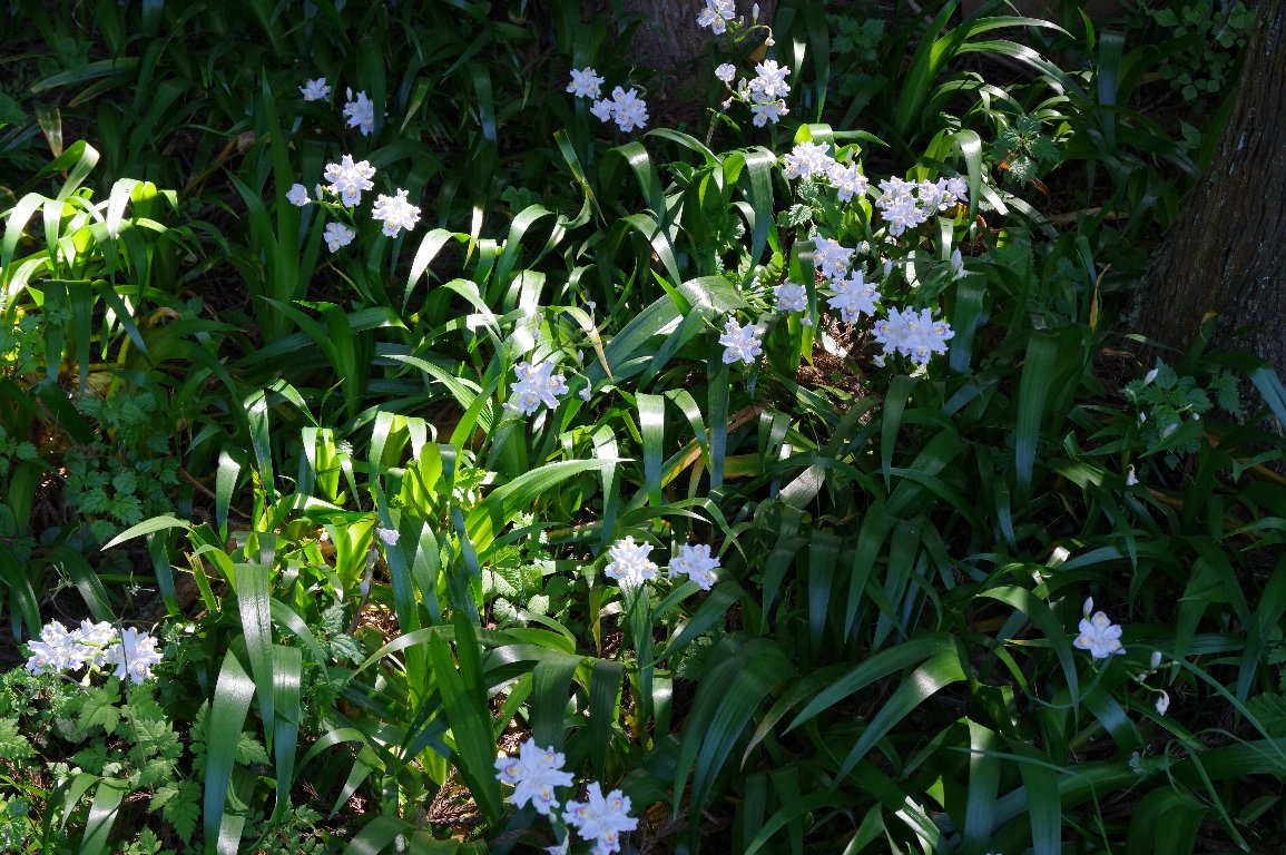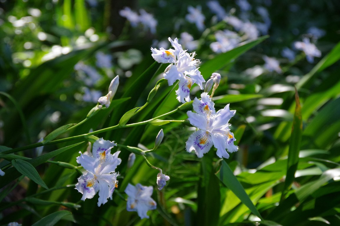 初夏の杉木立ちの下には、時おり、シャガが群れ咲いている。 淡い紫色と黄色の模様は、繊細で上品な趣だ。 木立ちの間から陽射しを受け、いっそう模様が浮かび上がっていた。 |