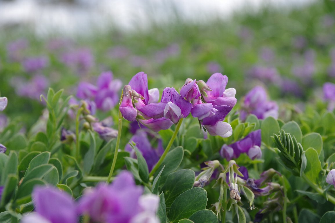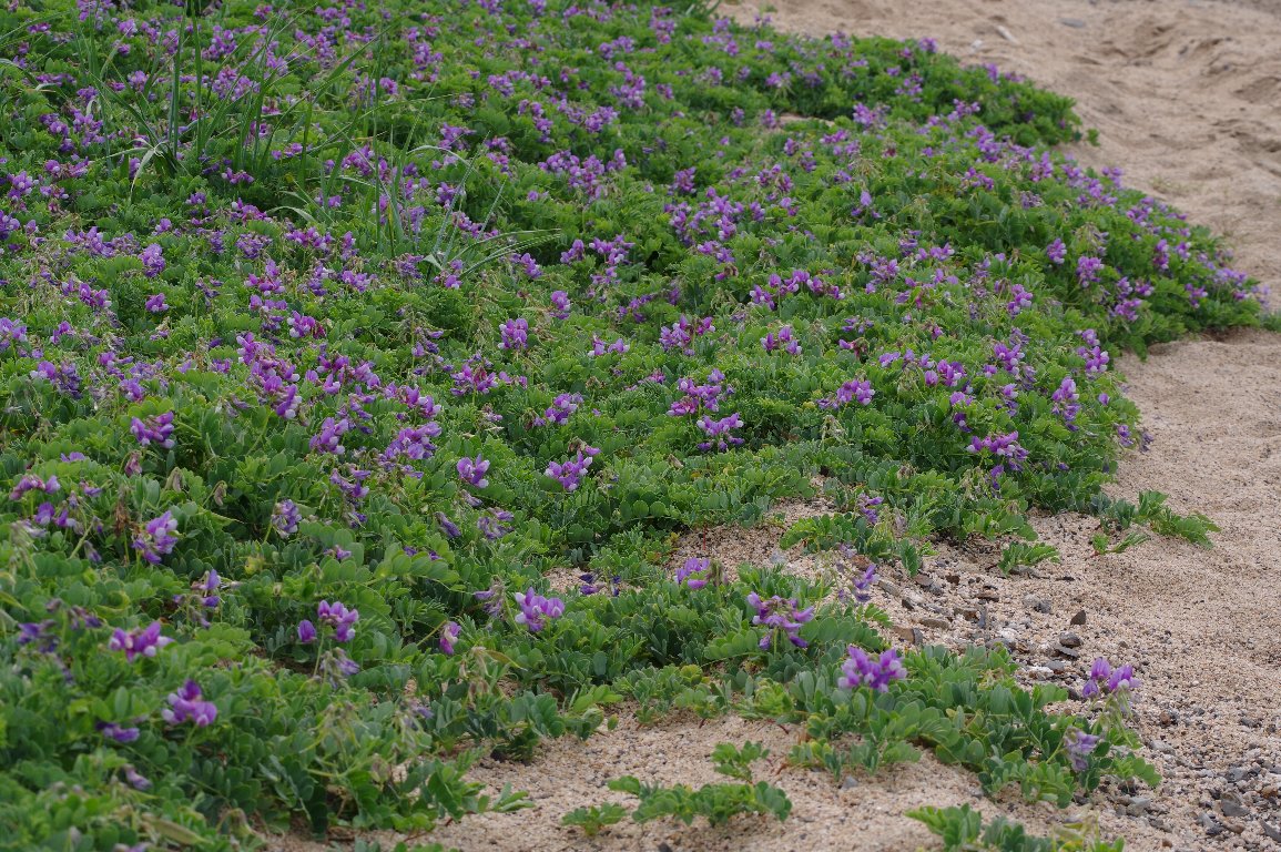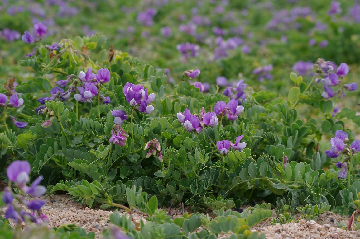 初夏の砂浜を覆う、緑色の弦のような葉っぱと、紫色の花。 マメ科のその花は、エンドウそのもので、ハマエンドウ以外の名前は考えられない。 |