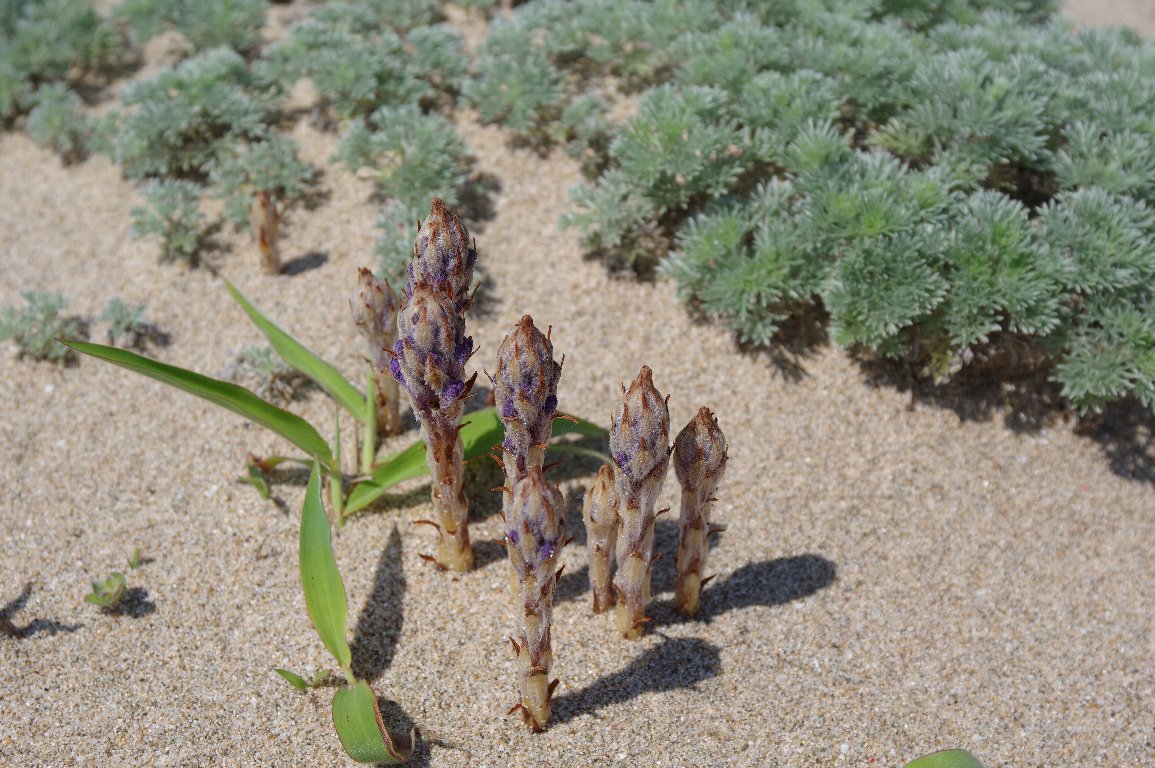 初夏、海岸の砂浜で、ニョキニョキっと伸びた、風変わりな花が幾つも咲いている。 その下には、絨毯のような緑の葉っぱ。 寄生植物のハマウツボと、その宿主のカワラヨモギだ。 |