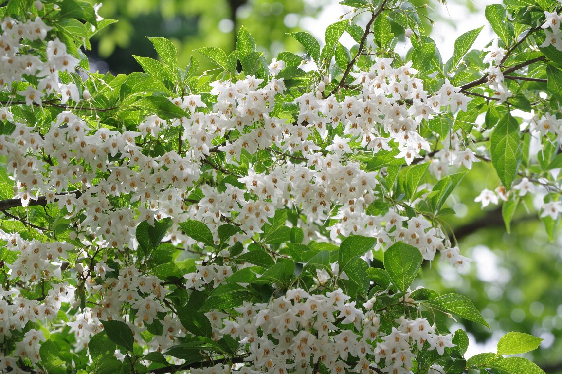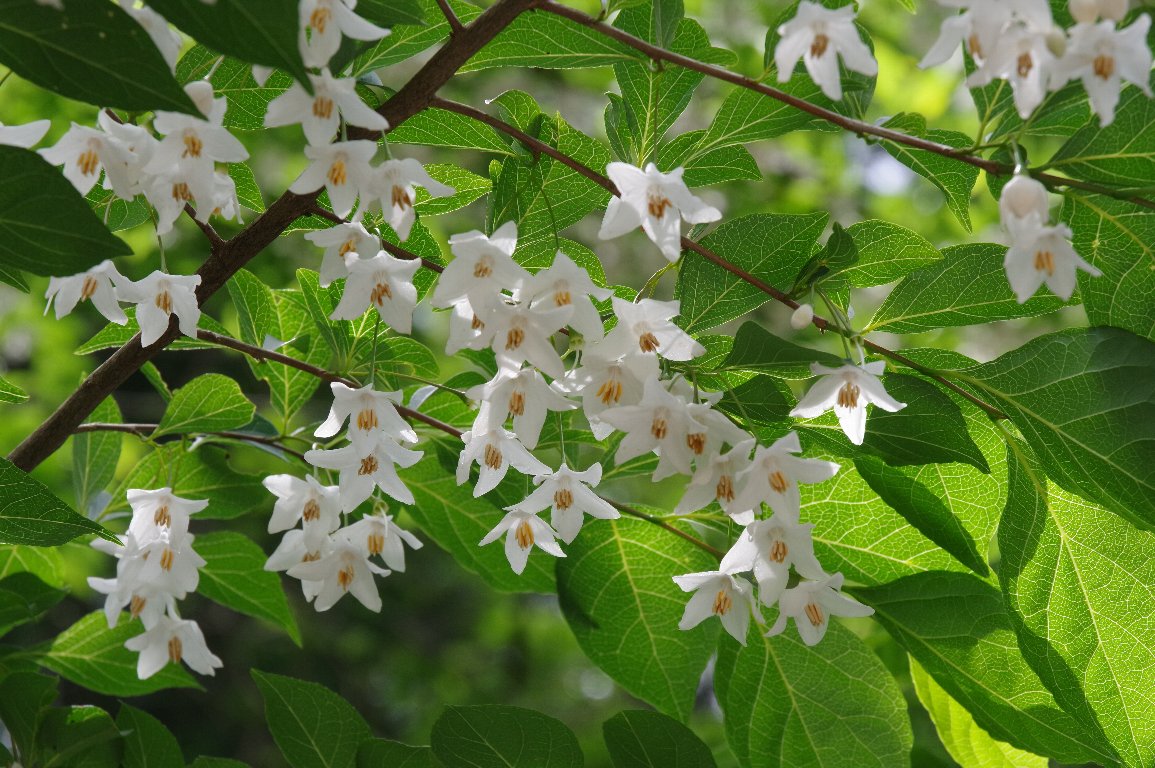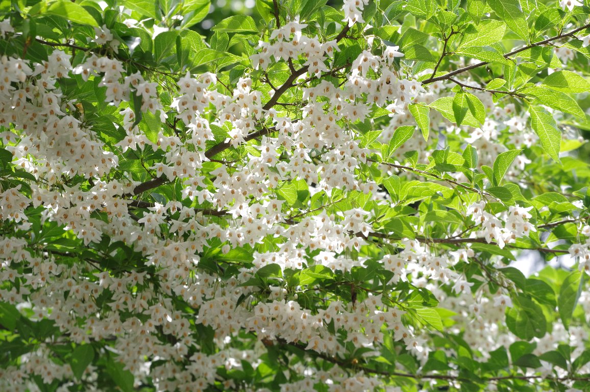 葉陰に、白い花を鈴なりに咲かせるエゴノキ。 空に向かって咲く花が多い中、なぜ、上から見ると死角になるような咲き方をするんだろう? 甘い香りを強く放つことが、その答えなのかもしれない。 |
