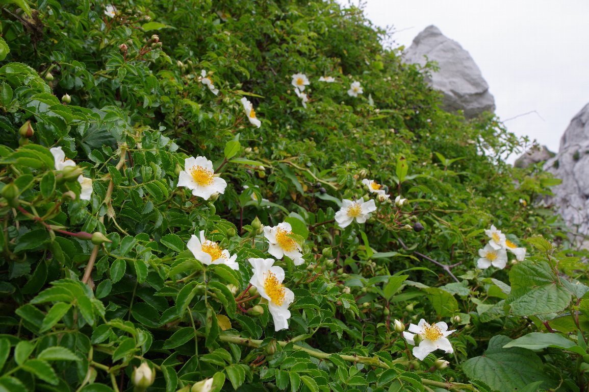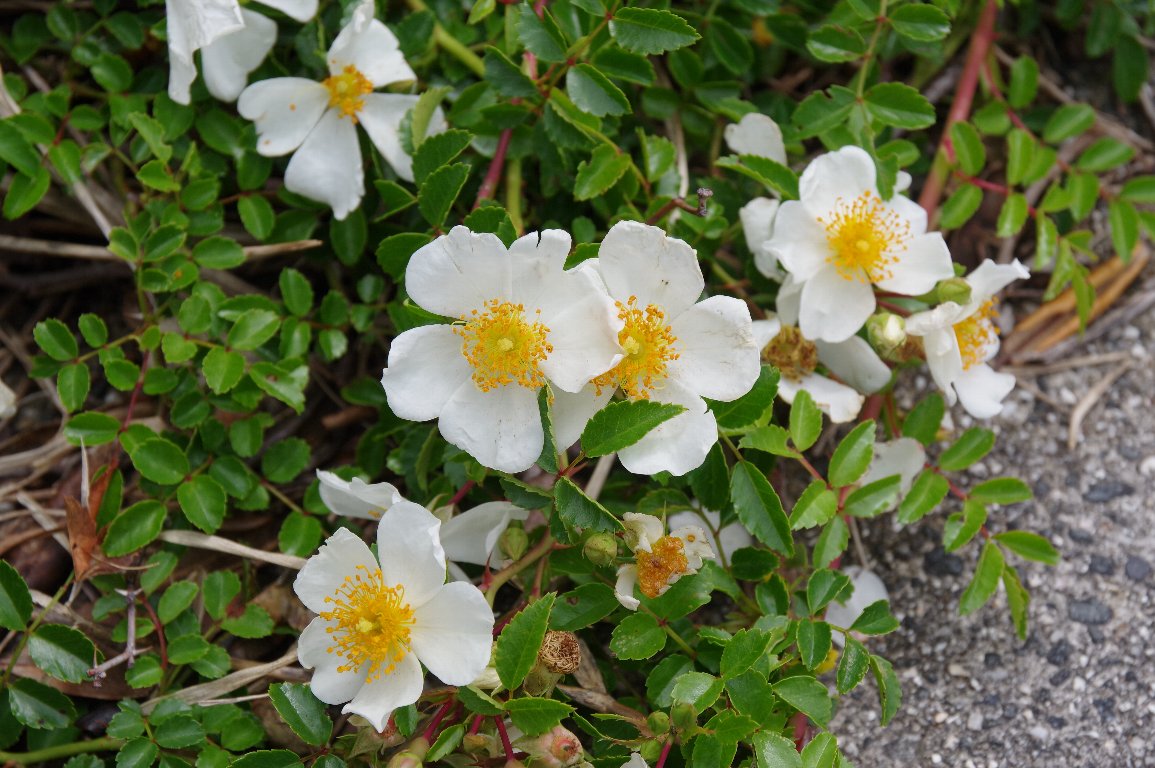 海岸に咲くテリハノイバラは、葉っぱがつやつやとしていて、山に咲くノイバラと、一味ちがう。 岩場から砂浜に張り出すように、ワイルドに広がっていた。 |