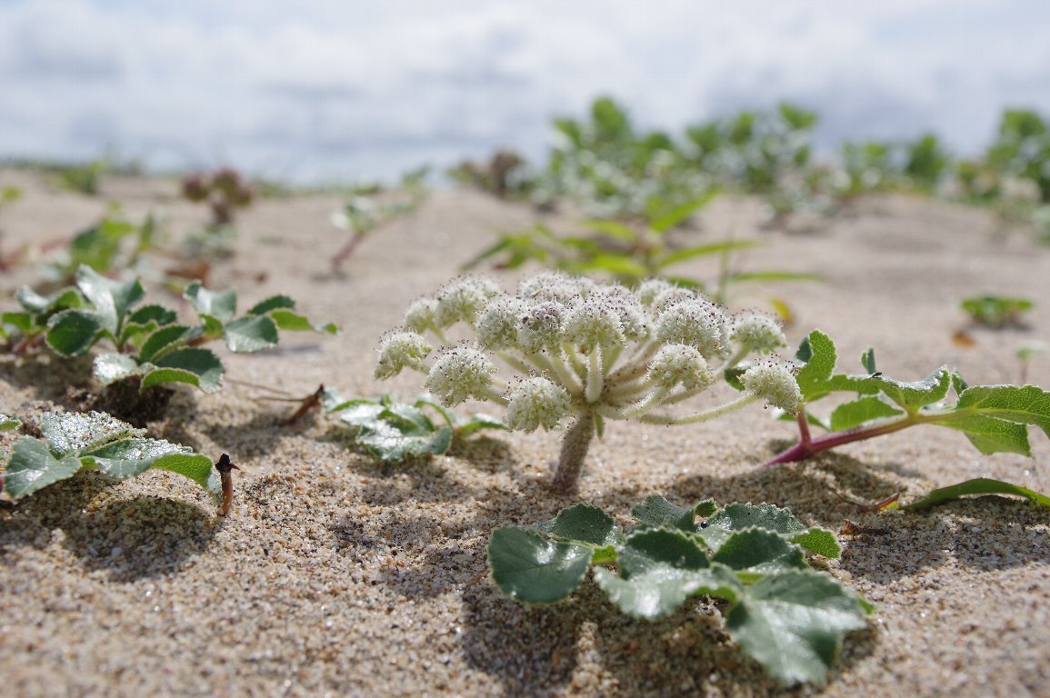 いろんな花が咲く初夏の砂浜にあって、ちょっと地味な、セリの仲間のハマボウフウ。 それでも、張り付くように広がって、四方八方に腕を延ばすように咲いている花は、 なかなかユニークだ。 |