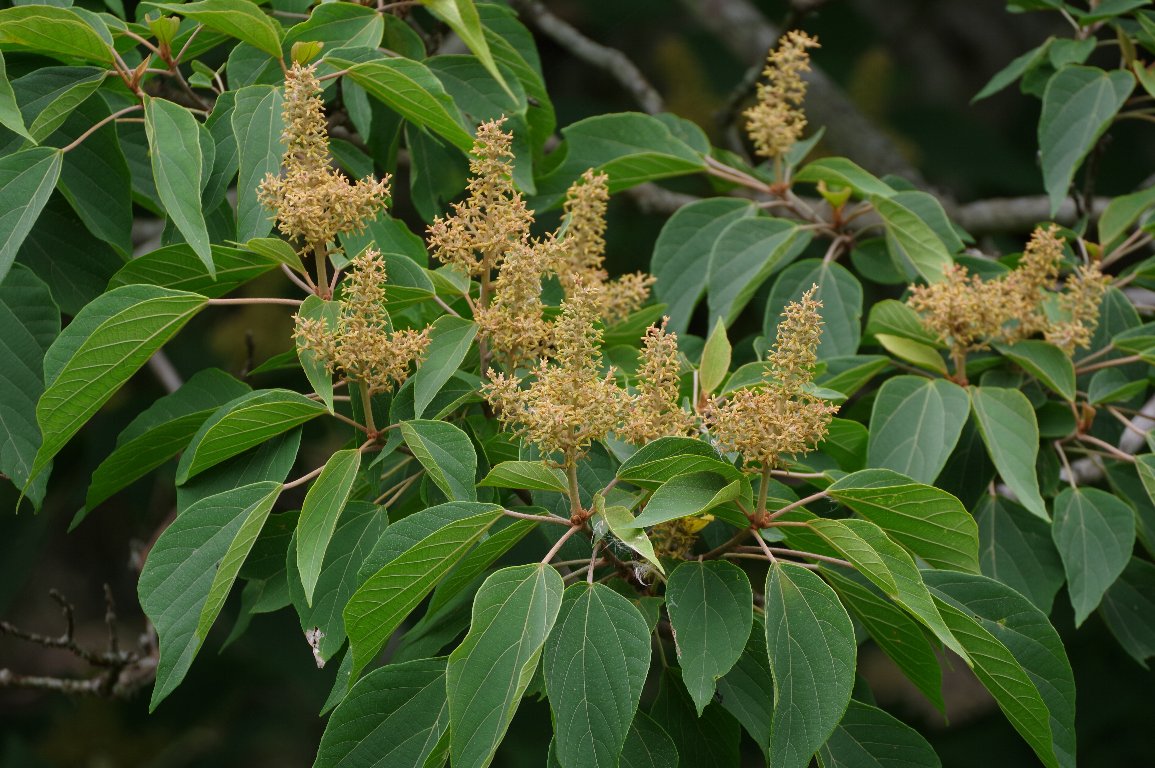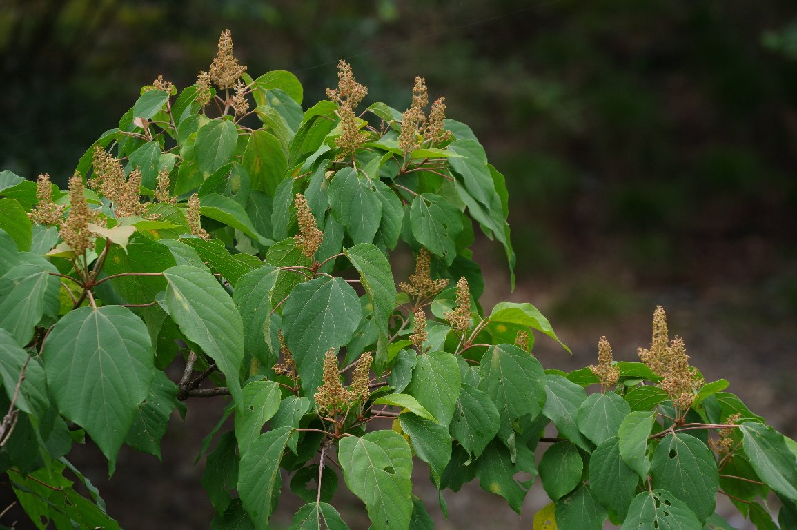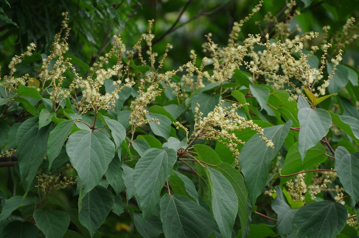 山のところどころで、アカメガシワが花をつけている。 雌雄異株なので、雄花をつける木と、雌花をつける木とが別々。 こちらは、雌花。薄い橙色の花が、木いっぱいに咲いていた。 |