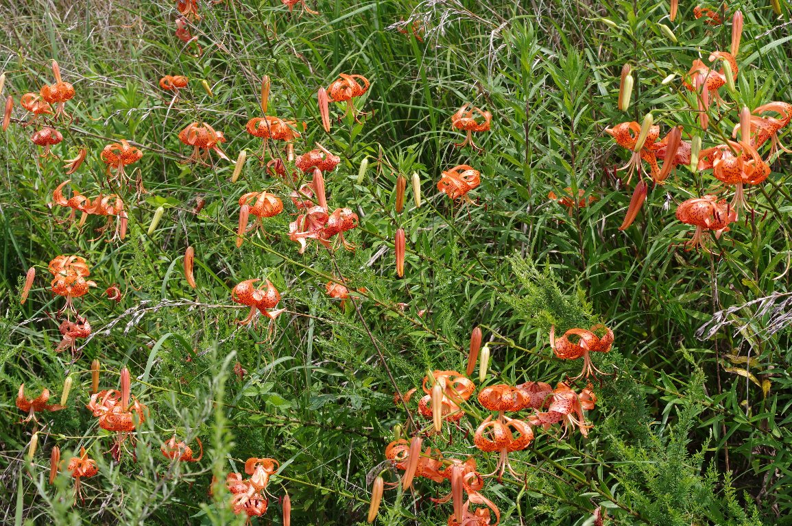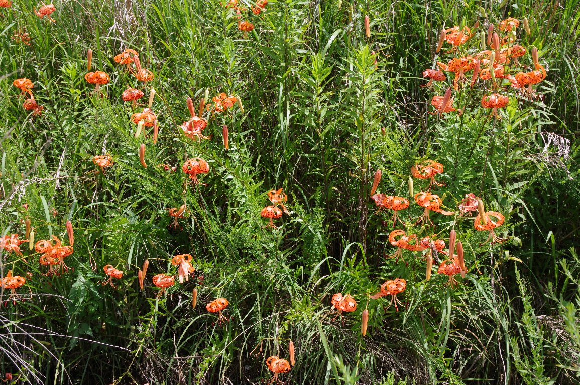 田んぼの中を走る道路の土手が、濃いオレンジ色で染まっている。 なんと、オニユリが凄い密度で群生していた。 草むらから伸びる、ワイルドなオニユリの姿は、見ごたえがあった。 |