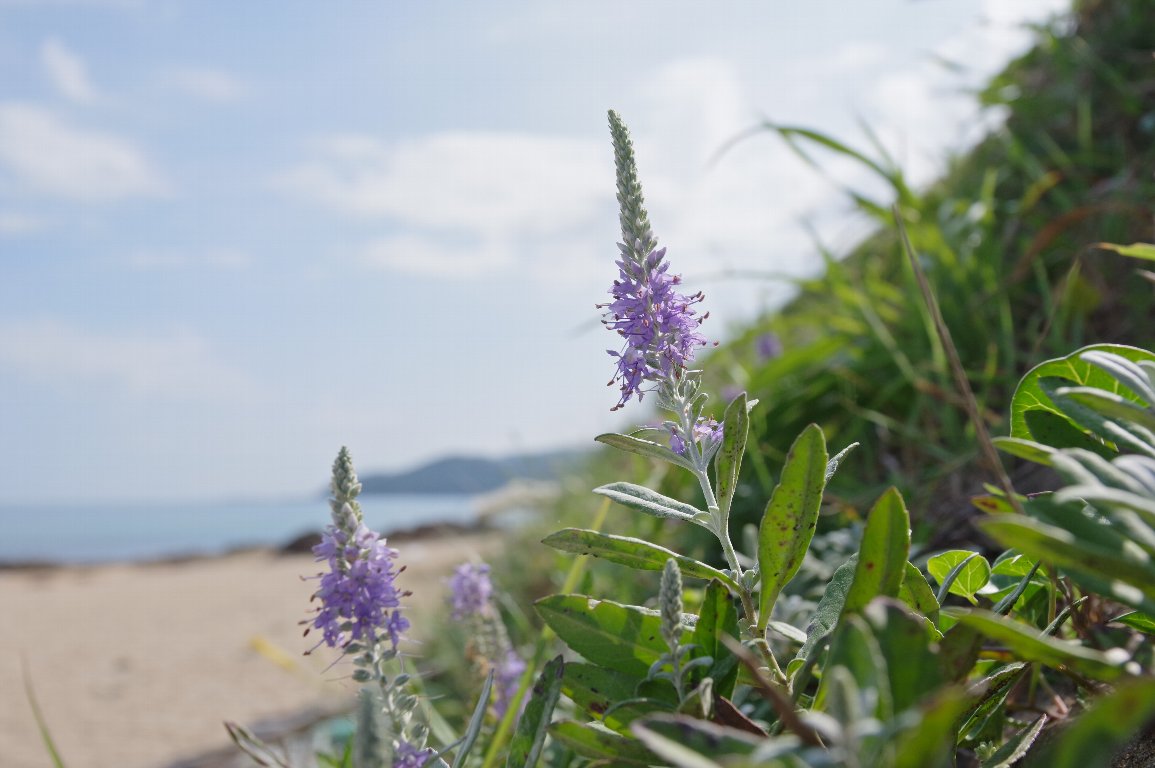 粉をふいたような白い茎、葉っぱの先に、薄紫色の花を咲かせるトウテイラン。 北向きの日本海の海岸。山の端から、遅い朝日が射し始める。 美しくも、たくましい姿だ。 |