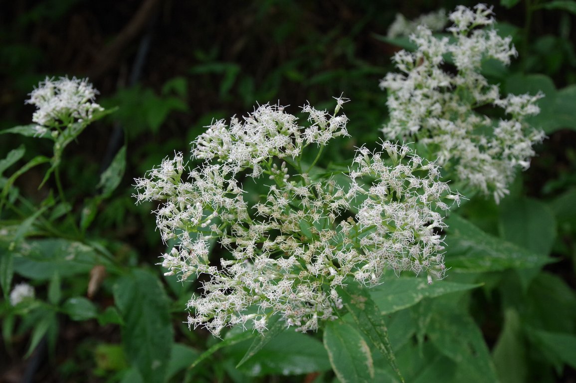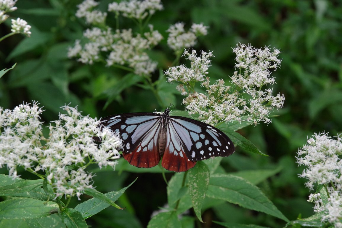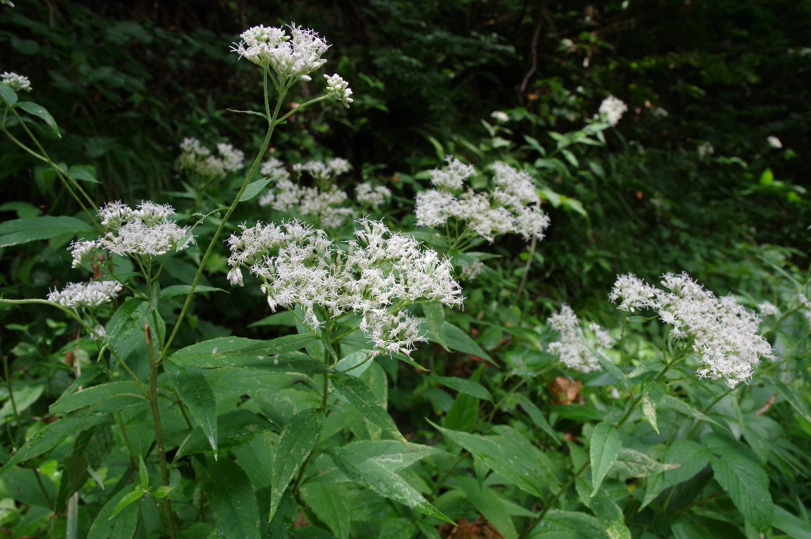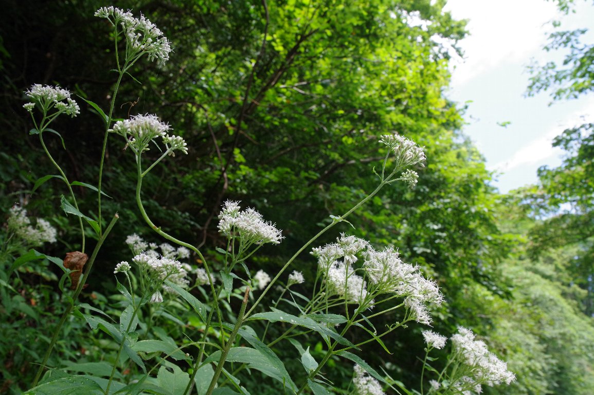 夏の盛りの林道、緑が濃い中、ヒヨドリバナの白い花が、道端を飾っている。 時おり、アサギマダラがひらひらと舞って、彩を添えていた。 |