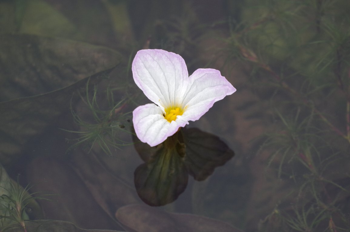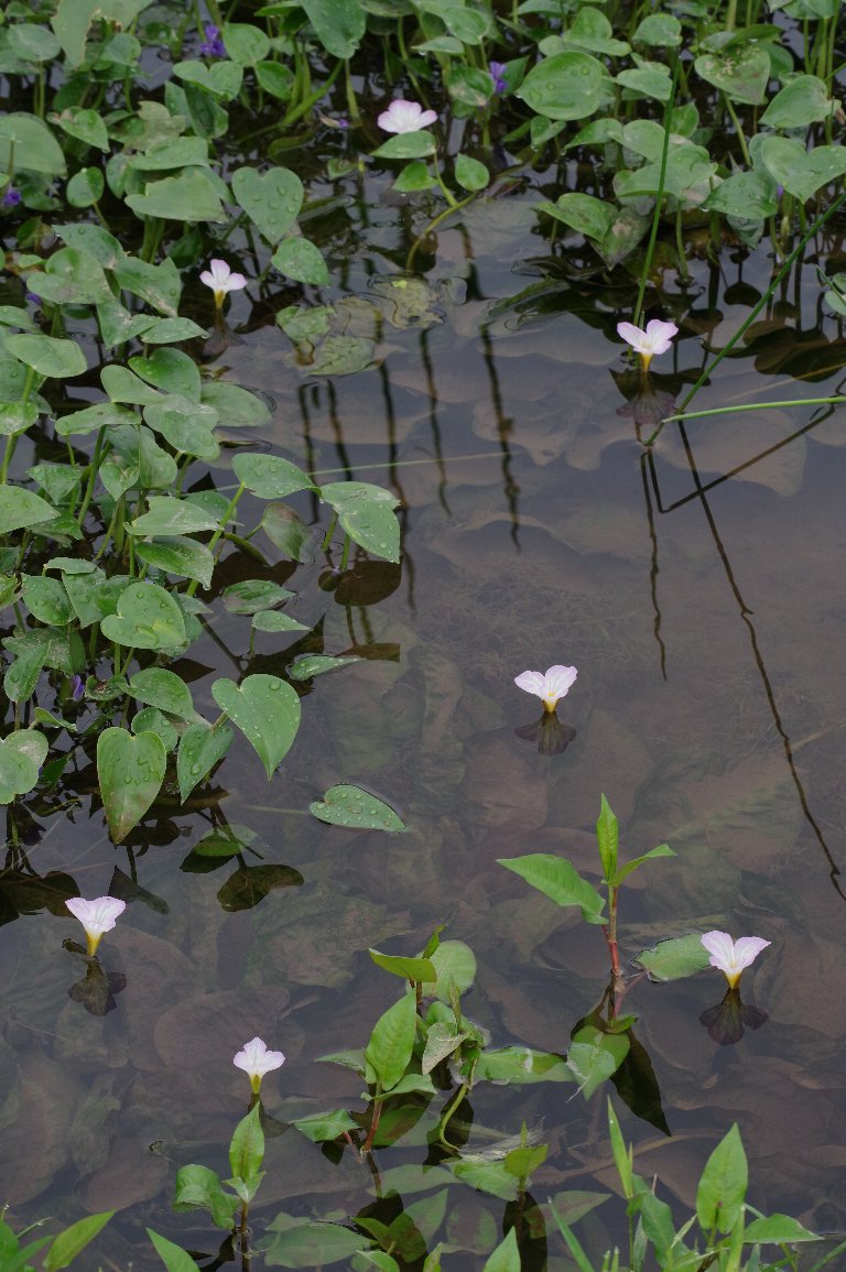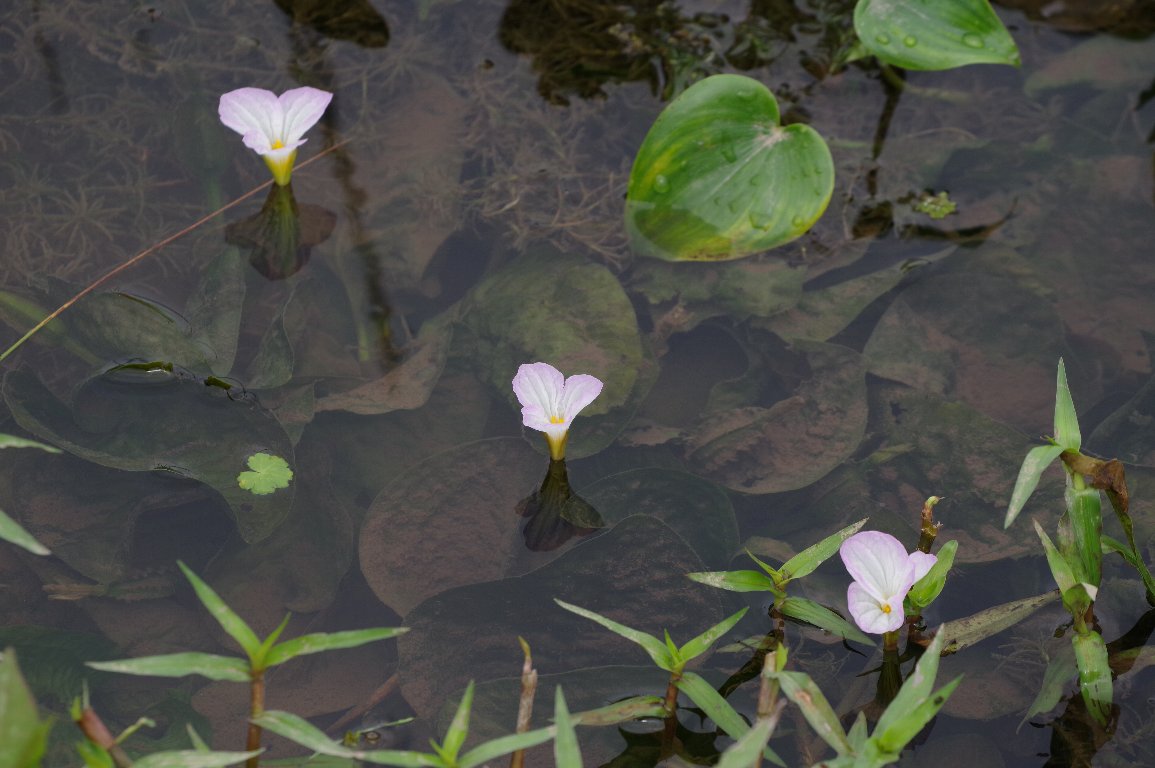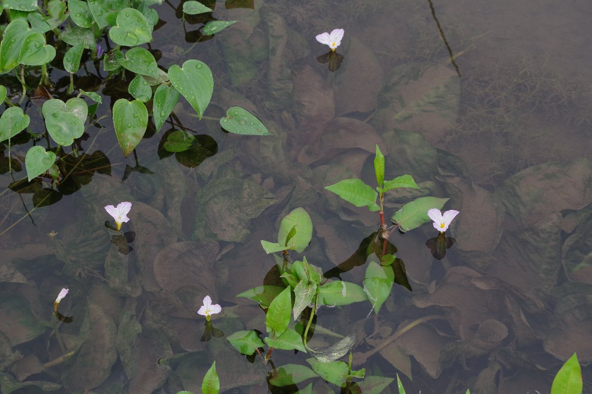 撮影雑記: もとは田んぼだったと思われる場所が、池になっていました。 なかなか見ることができない、いろんな水生植物があります。 ミズオオバコの花も、池のところどころに、点々と咲いていました。 ![]() 3枚の端正な花びらです。よく見ると、花びらのふちのほうが、ほのかに濃いピンク色になって、 頬紅をさしたかのようです。 ![]() 葉っぱは水中に広がっています。 少し波うって、葉脈が目立つ葉っぱの様子がオオバコの葉に似ているので、ミズオオバコの名があります。 ![]() 点々と咲いている様子が、かわいらしいですね。 ![]() と思ったら、こんなに賑やかな群落もありました。 ちょっと池の中の方だったので、残念ながらこれ以上は近寄れませんでした。 ![]() |