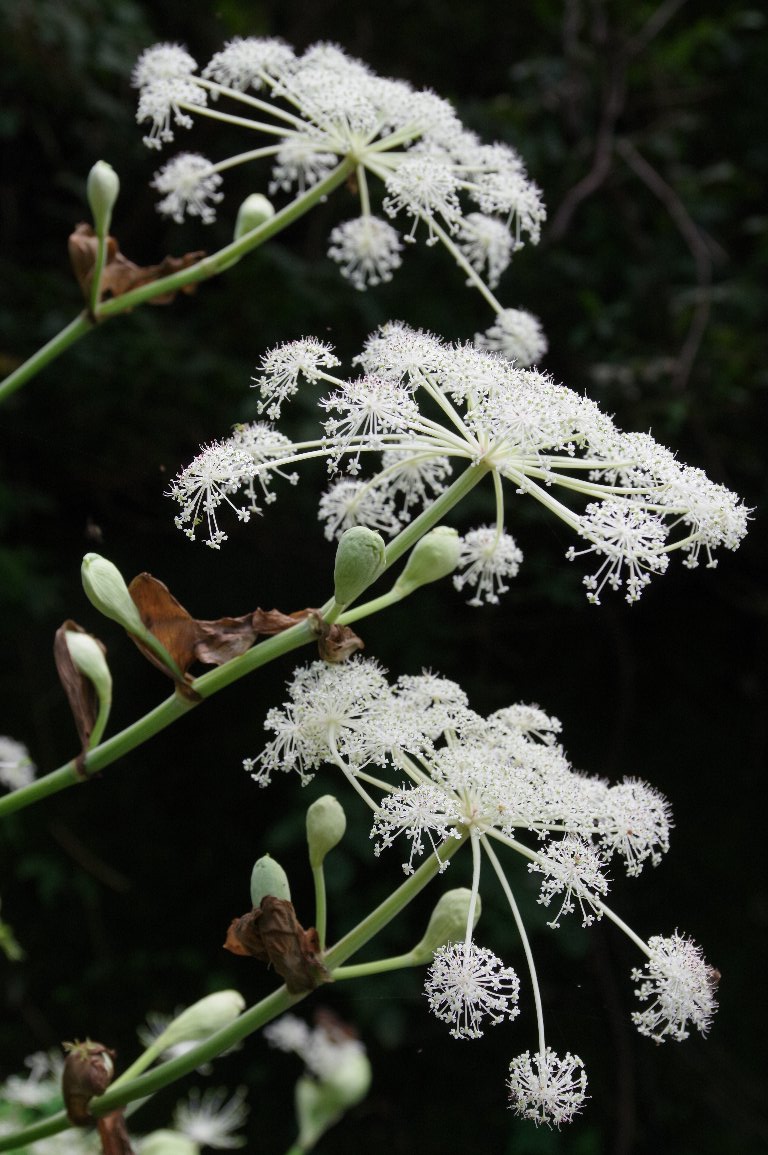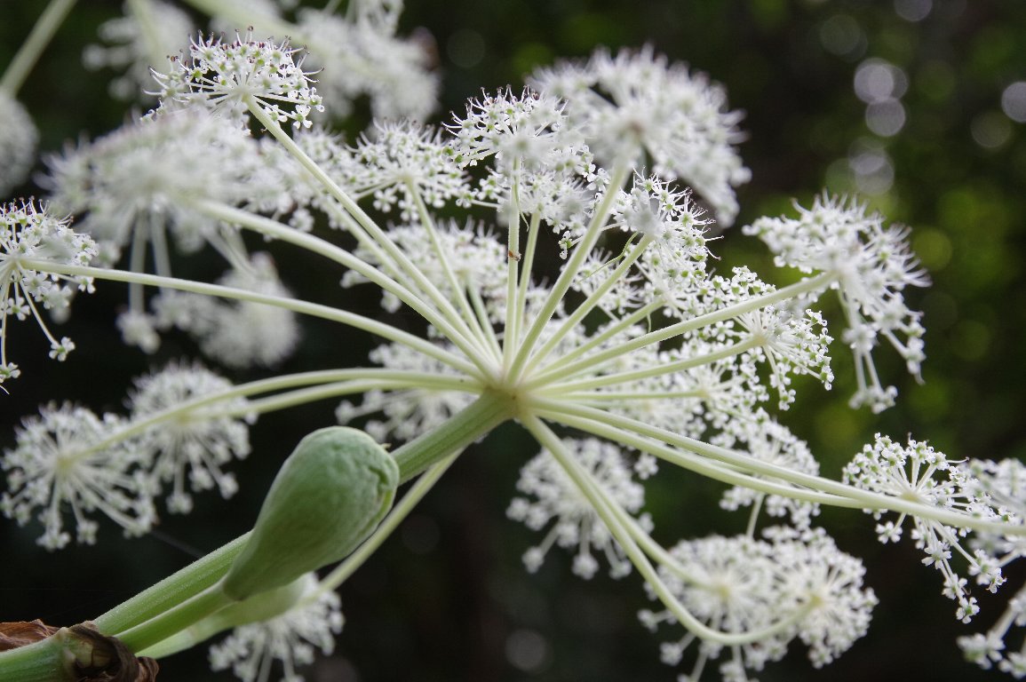 シシウドは、がっしりとした、大型のセリの仲間。 山道の道端に、四方八方に枝を広げ咲く花は、パッと開いた花火のようだ。 横から、上から、下から、どの方向から撮ってもおもしろい。 |