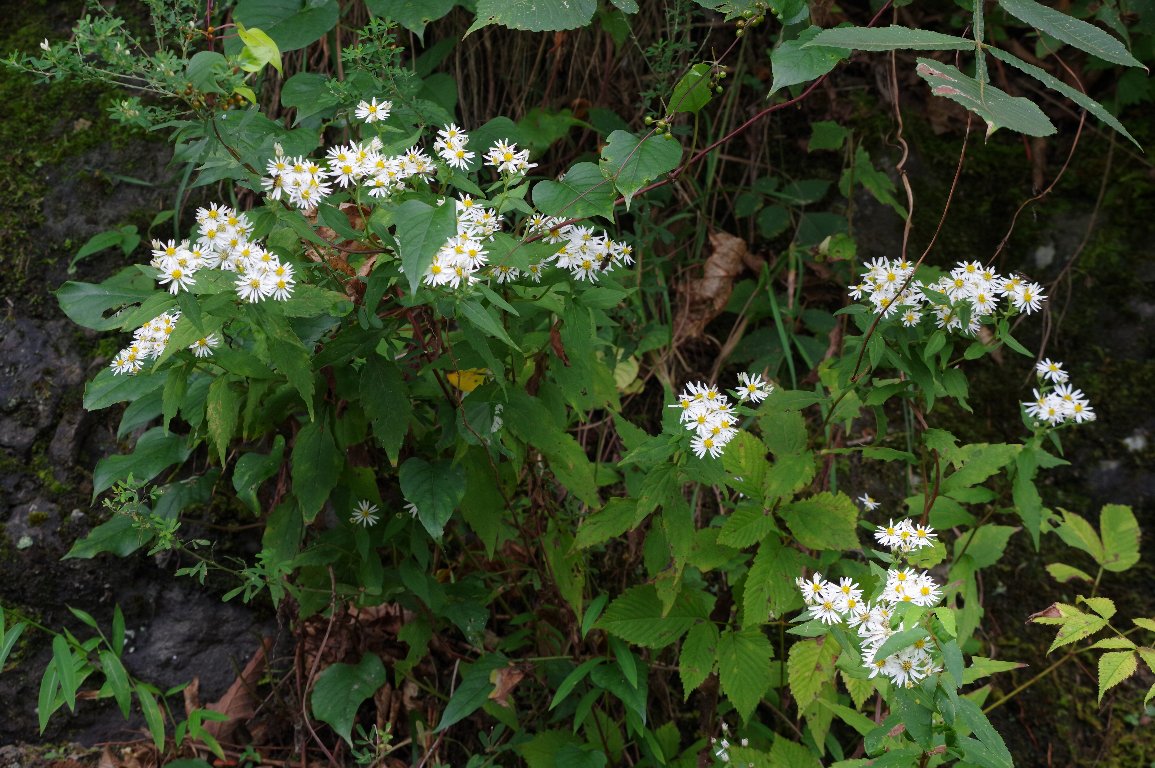 林道を進んでゆくと、野菊の花が、あちこちの斜面や道ばたに咲いている。 岩場のくぼみに咲いていたのは、ややざらざらした葉っぱなので、おそらくは、 イナカギクだろう。 |