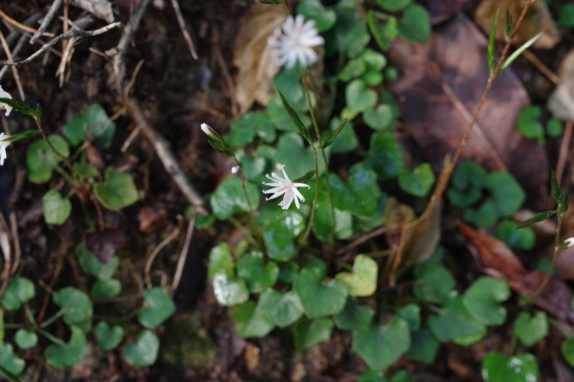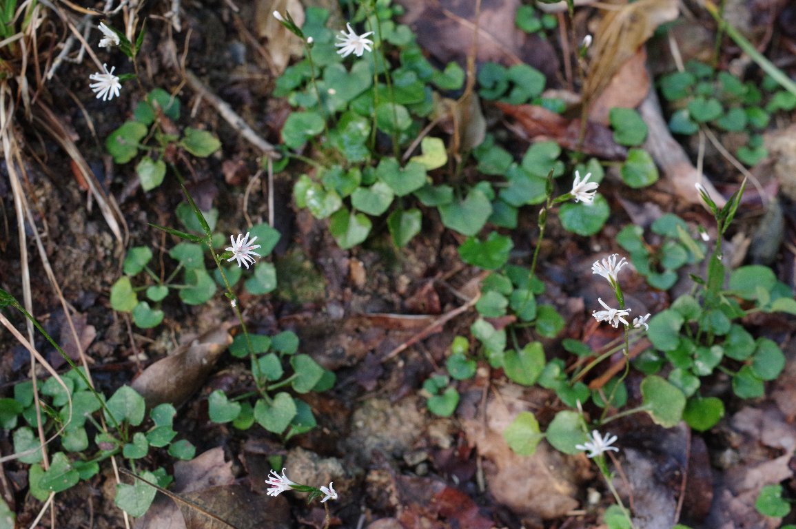 5角形の小さな葉っぱが特徴的な、キッコウハグマ。 ハイキング道の足もとをふと見やると、あれ、こんなところに咲いている、と気づくような花だ。 |