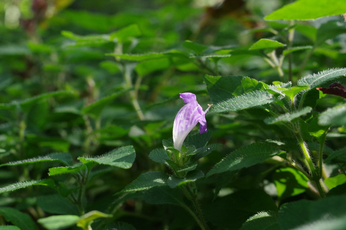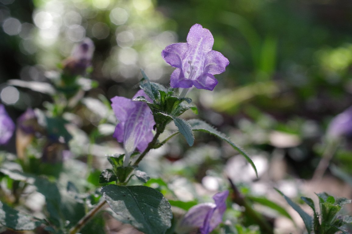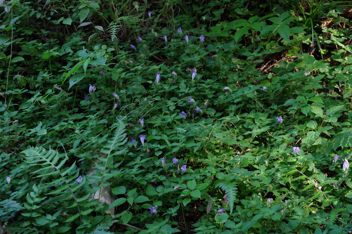 地面に低く広がって、小さな紫色の花を付けるユキミバナ。 沢沿いの小道の足もとに、点々と広がっているが、注意してみないと見落としてしまう。 午後になるとしぼんでしまう花は、午前の光を受けて咲いていた。 |
