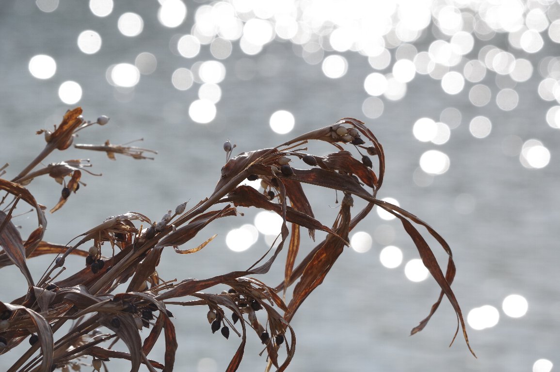 池のほとりに、枯れたジュズダマが残っていた。 よく見ると、名の由来となった、数珠玉のような固い実も生っている。 水面に反射する光がキラキラして、シルエット姿が印象的だった。 |