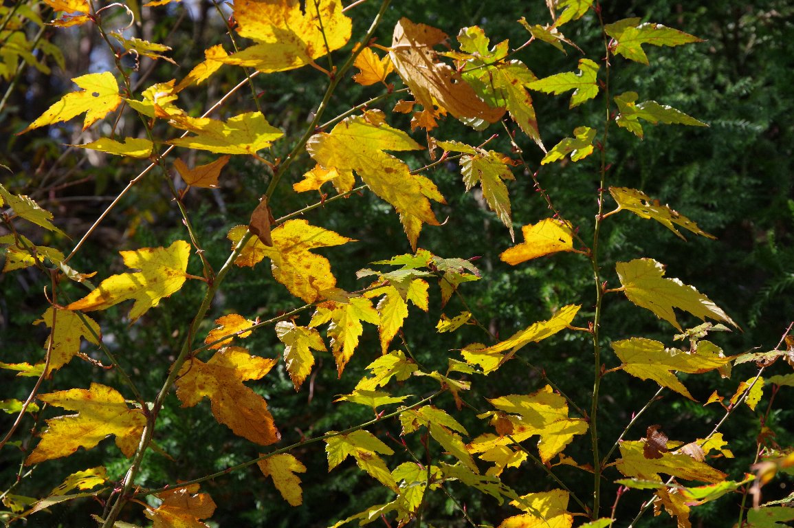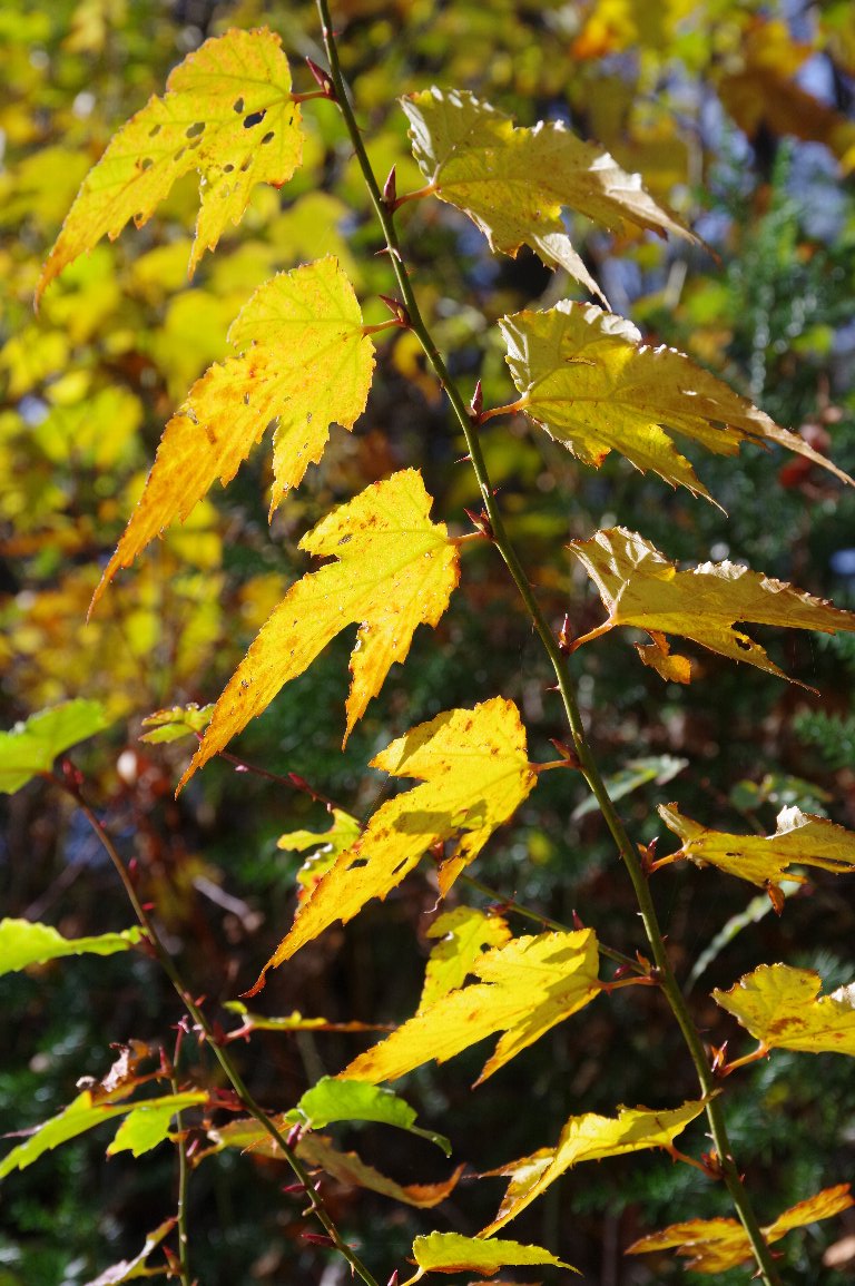 道ばたで、ナガバモミジイチゴが黄葉していた。 白い花や、オレンジ色の実は、よく目にするものの、葉っぱが黄葉することは、あまり気づいていなかった。 |
