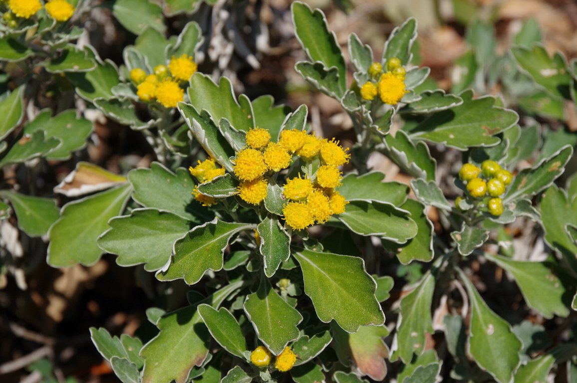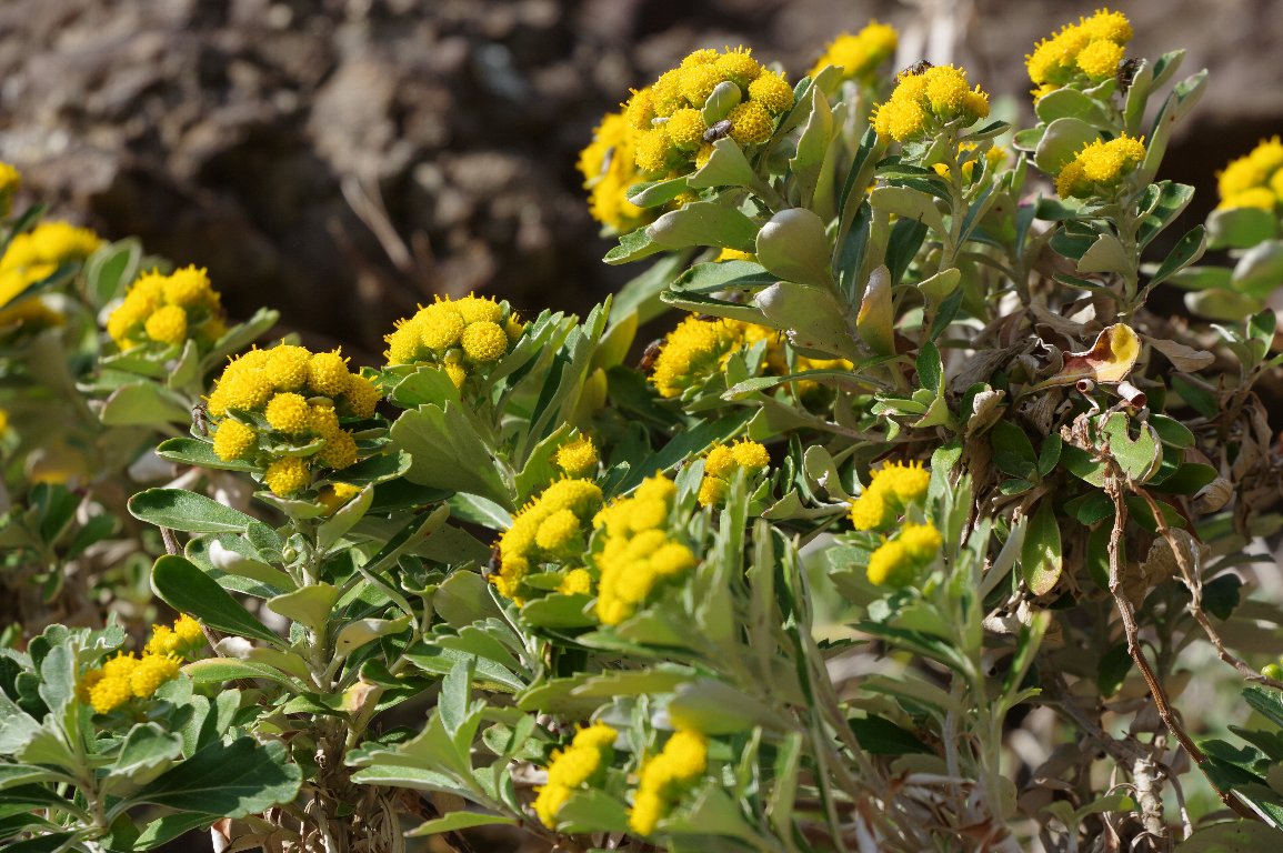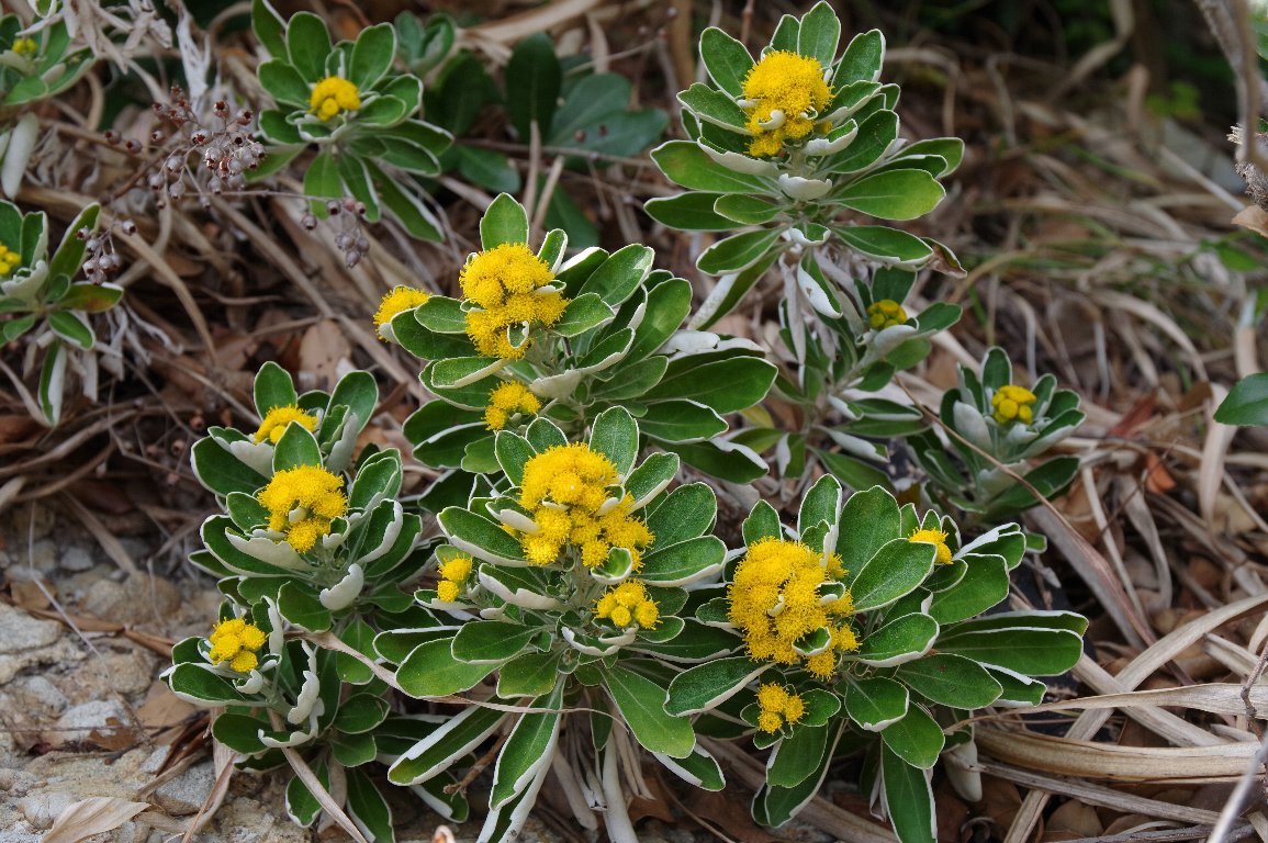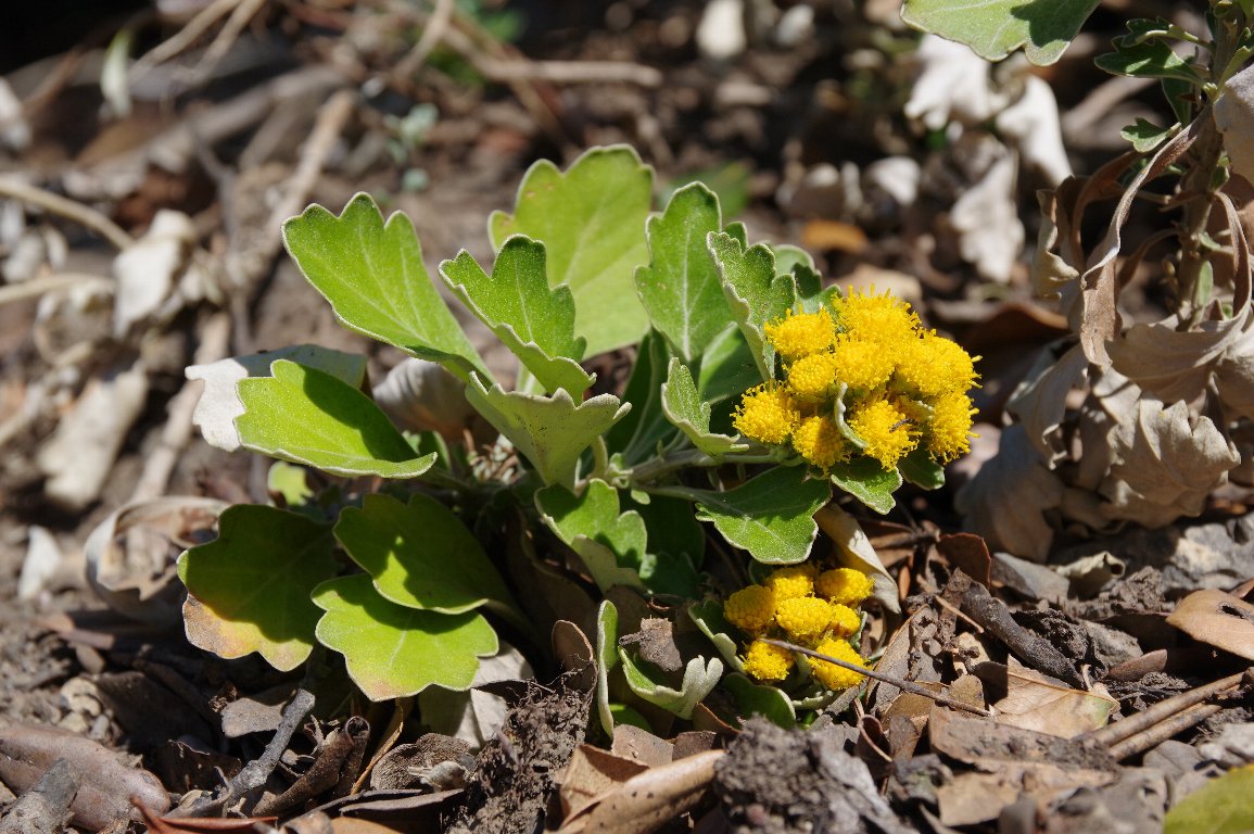 南紀の海岸の岩場に咲く、野菊のキノクニシオギク。 花びら(舌状花)はなく、黄色いポンポンのような花が、固まって咲く。 初冬の海岸は、それほどの冷え込みもなく、低い日差しを受けていた。 |