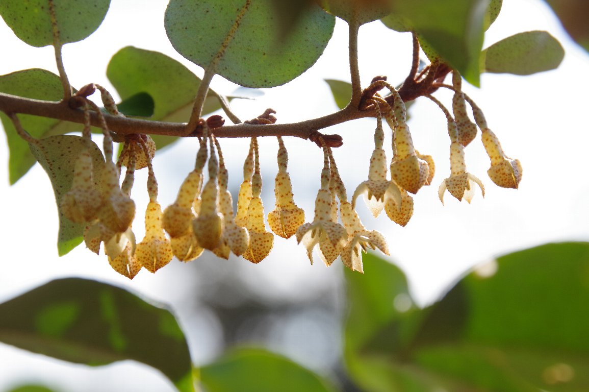 砂浜を散策し、戻ってくる道ばたで、グミの花が咲いていた。 こんな時期に咲くグミがあるとは知らなかったが、ツルグミと言うらしい。 ぶらぶらと並んだクリーム色の花が日を受け、灯りをともしたようだった。 |