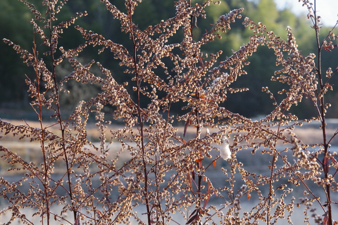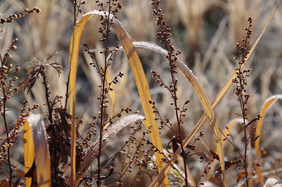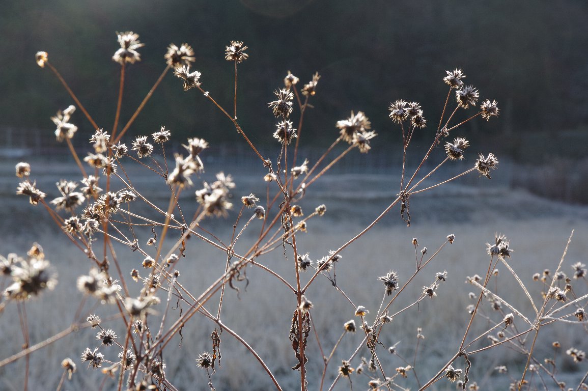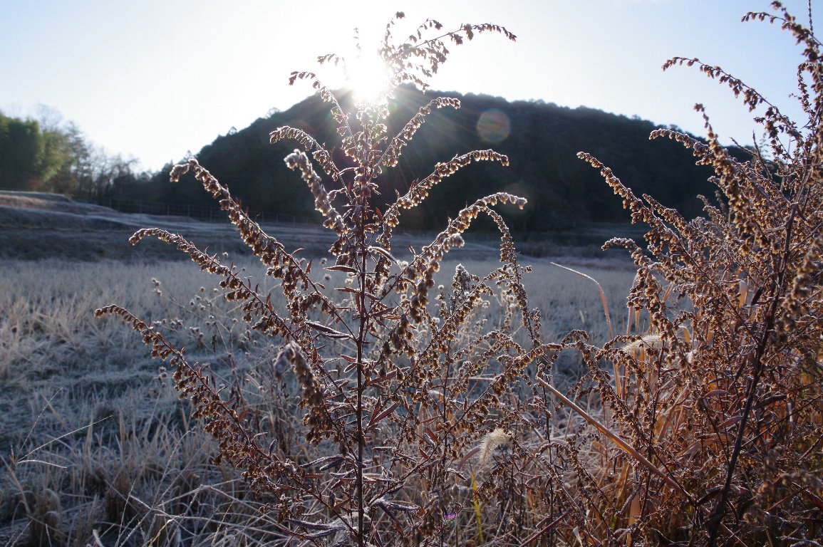 淡い12月の霜が、刈り残されたあぜ道のヨモギにも、びっしり降りていた。 間もなく、バンザイをしたようなヨモギに、遅い朝日が差し込んできた。 |