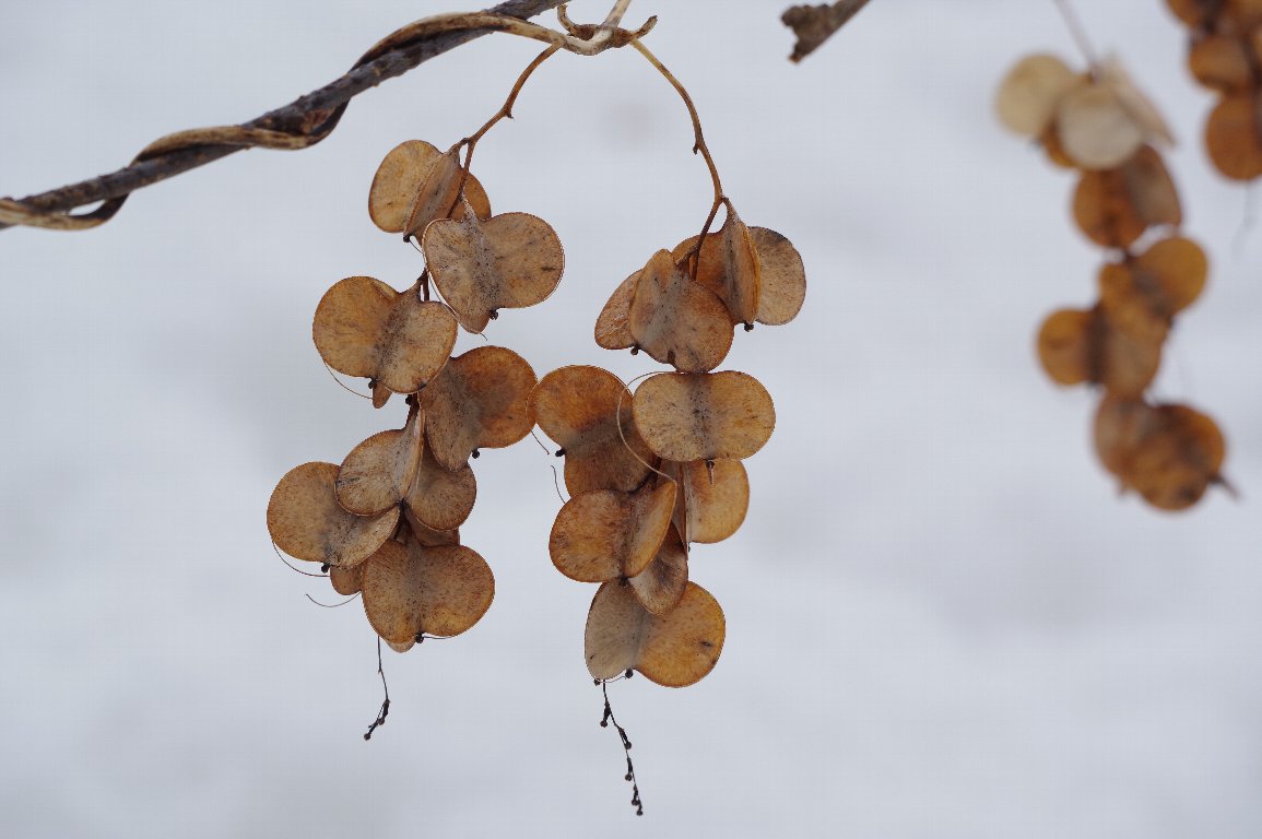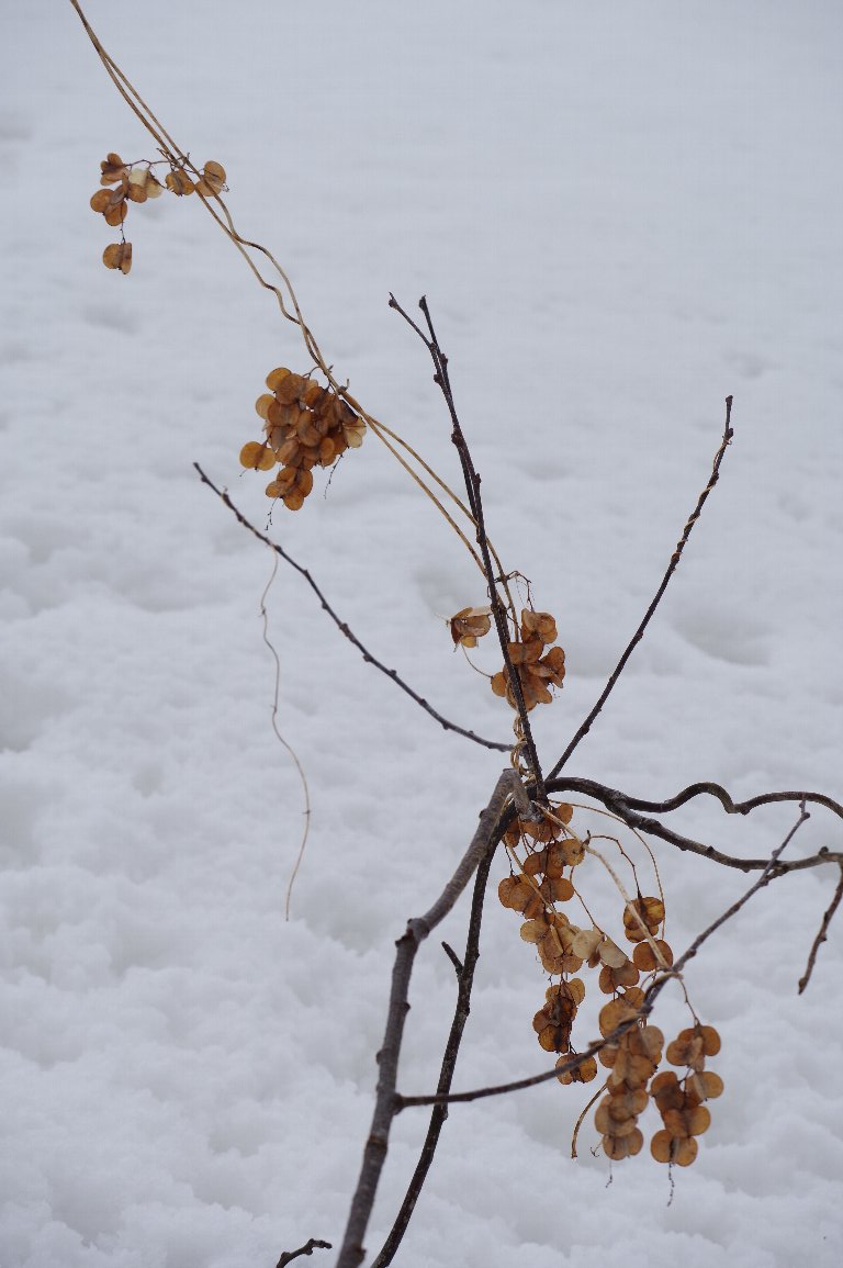 丹後の山は雪に覆われて、地面は白い雪景色。 雪の中から顔を出している枝にヤマノイモが絡み、軍配のような形の茶色い殻が、 飾りつけたようにぶら下がっていた。 |