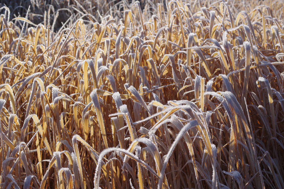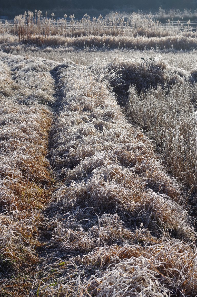 びっしりと霜が降りた、田んぼのあぜ道。短く刈られているが、よく見ると、ところどころ、