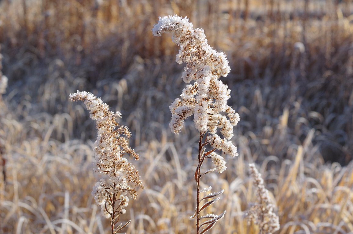撮影雑記: 近頃は、ワイヤー式の草刈り機によって、田んぼのあぜ道や土手の草も、舐め取られたように 短く刈られてしまいます。 霜の景色を探しに行っても、そんな、坊主頭のような土手ばかり。 なんとか、少し伸びていたチガヤを探して撮ったのが、上の写真です。 赤い、スイバの葉っぱも、良いアクセントになりました。 少し歩くと、刈り残されたチガヤがありました。 きれいに霜が降りています。 ![]() セイタカアワダチソウも、ところどころ枯れ残っていました。 枯れた花に霜が降りて、ふわっと雪が積もったようでもあります。 ![]() さらに歩いてゆくと、枯れ草も残っていて、一面、霜景色でした。 ![]() |