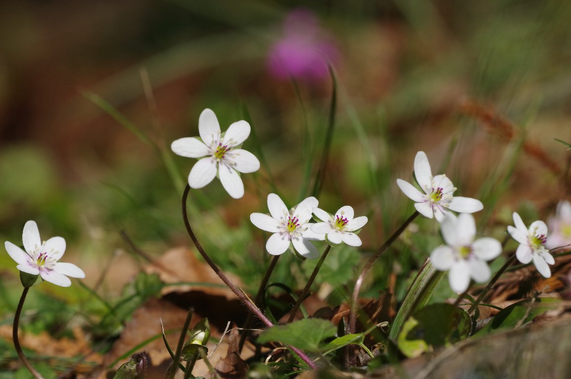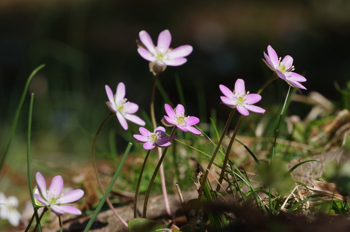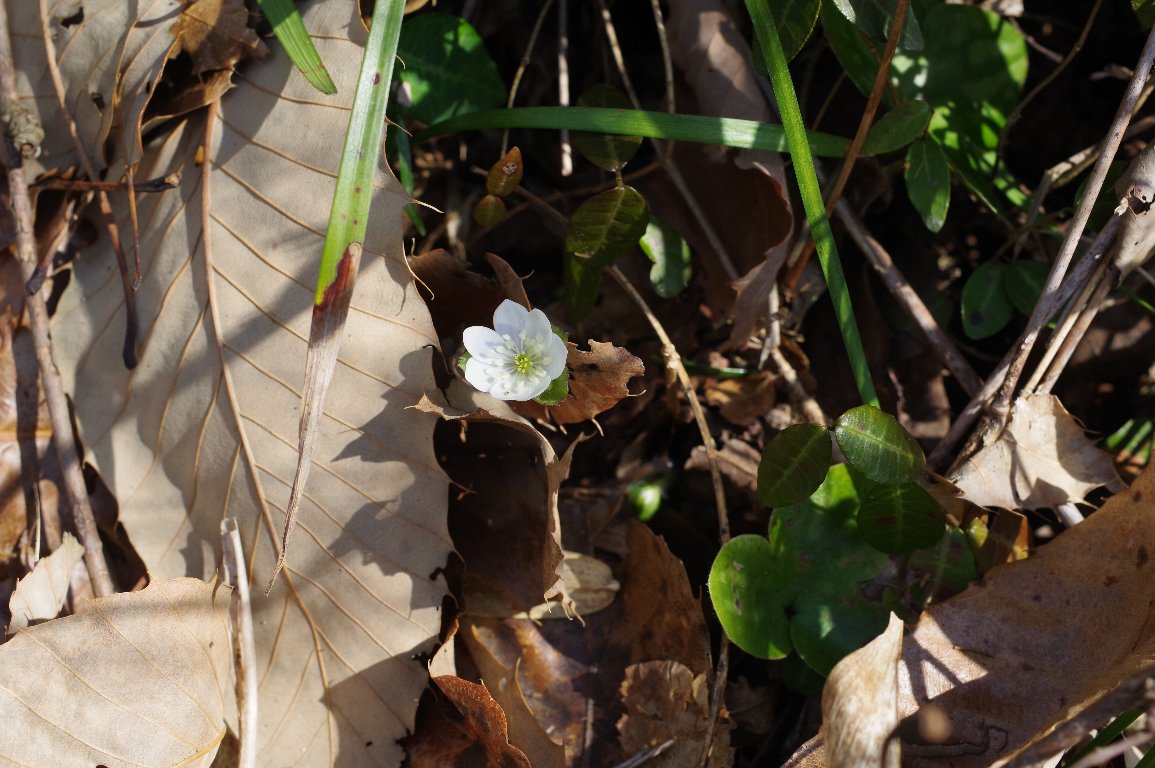 枯れ葉の積もった小道を歩いてゆくと、あった! 落ち葉の間から顔をのぞかせた、一輪のピンクのミスミソウ。 ちょうど、日が当たり始めて、笑顔でこっちを見ているようだった。 |