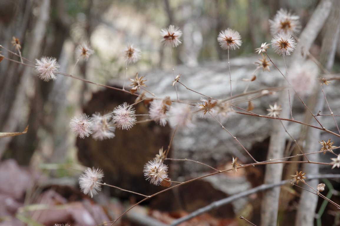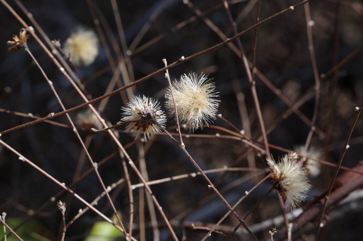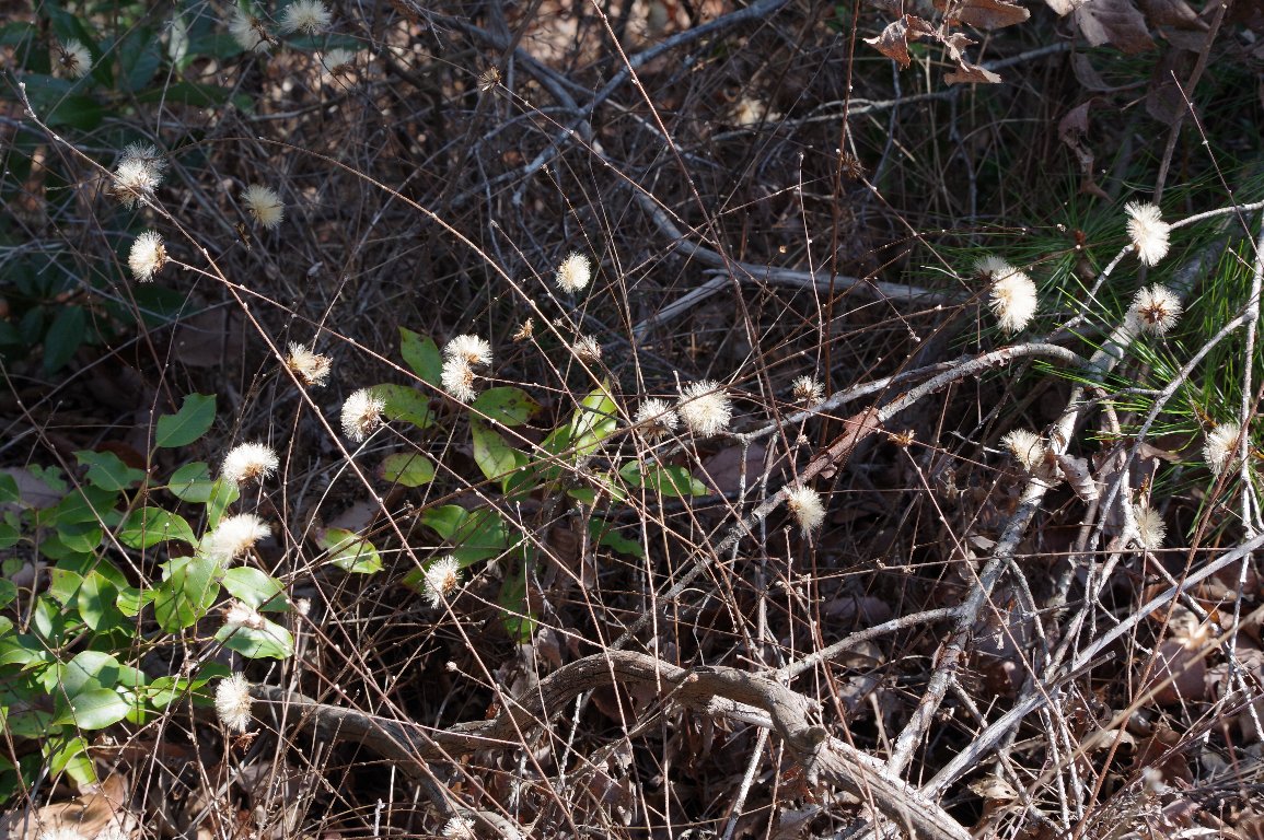 コウヤボウキの白いふわふわの冠毛は、案外、春先まで残っている。 山道を歩いていると、土がむき出しのところで、見かけることが多い。 四方八方に茎が伸びているので、写真に撮る角度を探すのに骨が折れる。 |