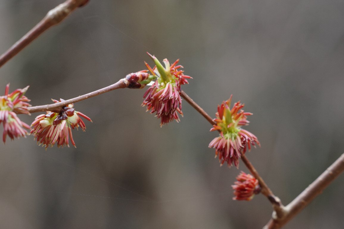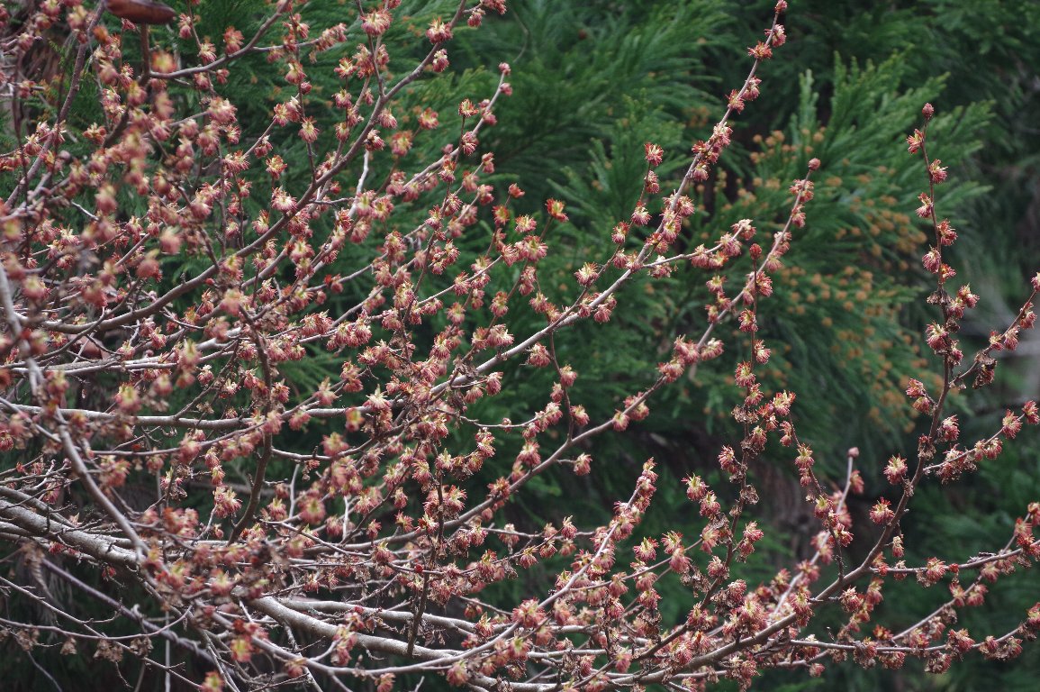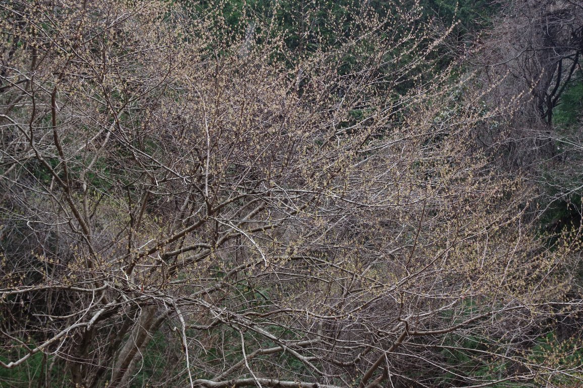 早春の谷間で、えんじ色のしべだけの花を咲かせる大木、フサザクラ。 サクラの名があるが、全く別の仲間。 えんじ色なのはおしべで、10日もすると萎れて、代わって薄黄色のめしべが展開する。 |