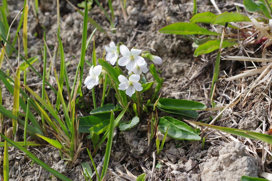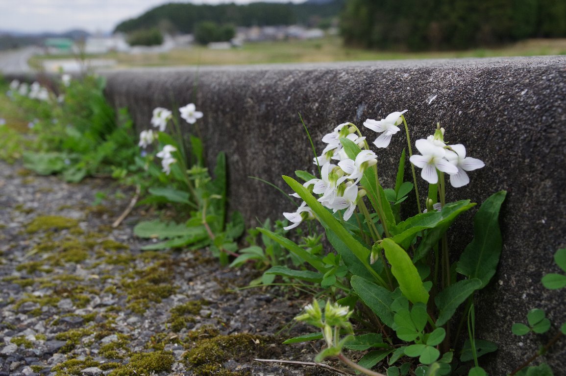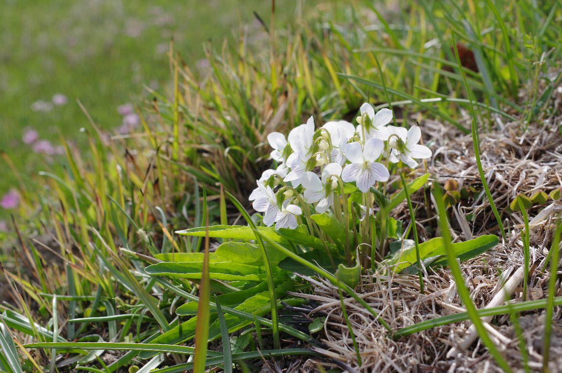 青々とした芝草の田んぼの土手に、白いスミレが咲いていた。 白花のアリアケスミレと思われる。 まるで、誰かがそこに飾ったような、天然のブーケだった。 |