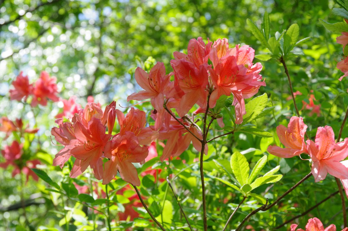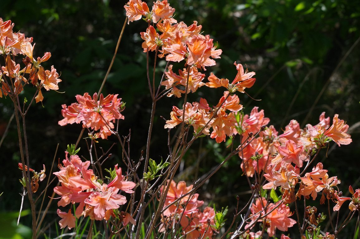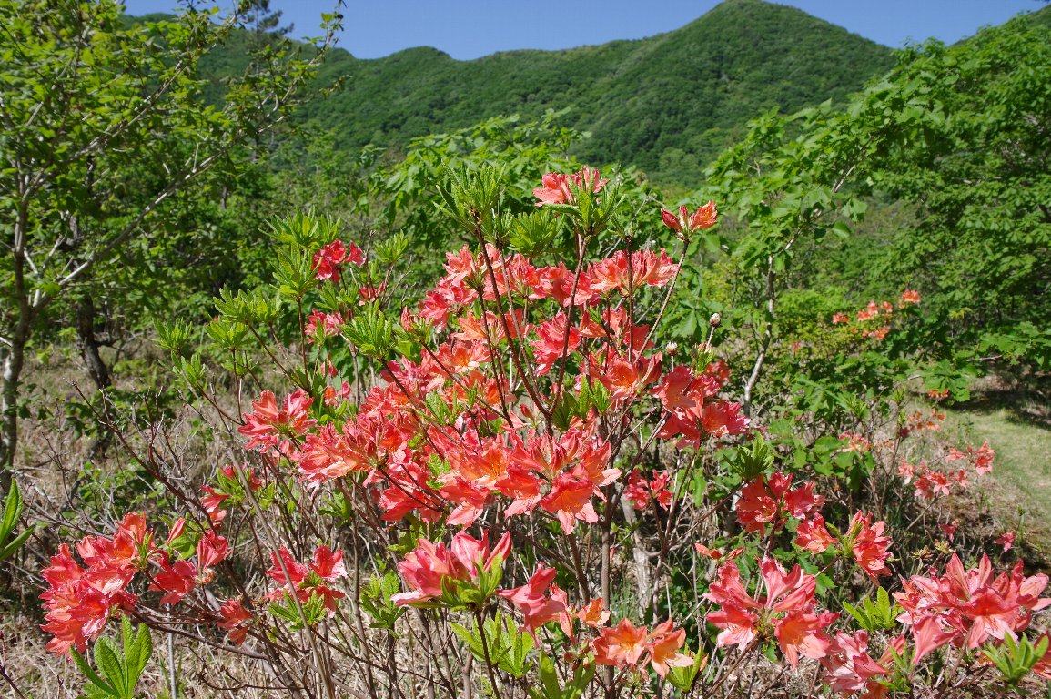 初夏の三瓶山を飾る、レンゲツツジ。 その鮮やかな花の色は、橙色と朱色の中間の色、と言えばいいだろうか。 強い日差しを受けて、写真に撮ると、色が飽和しそうだ。 |