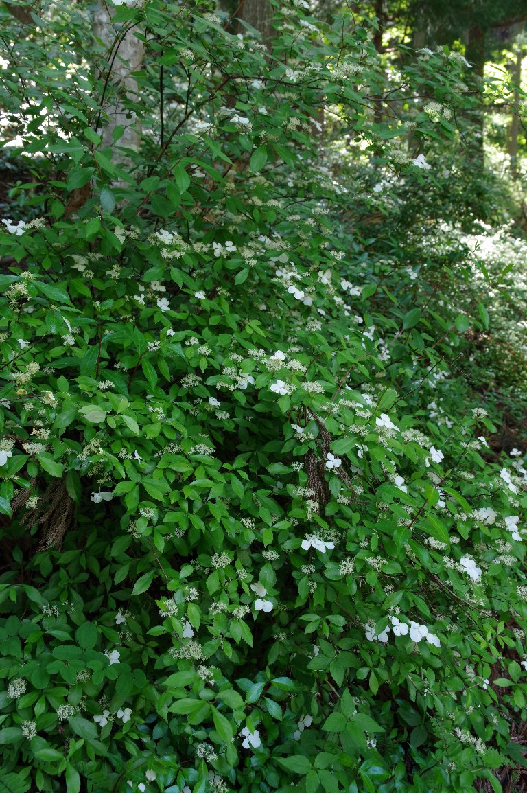 コガクウツギは小低木で、山の木陰で、よく見かける。 これもアジサイの仲間で、白い装飾花を付ける。 地味な存在だが、緑の葉に白い花をちりばめた姿は、捨てたもんじゃない。 |