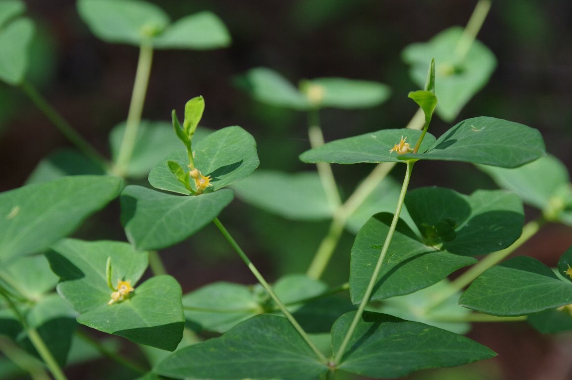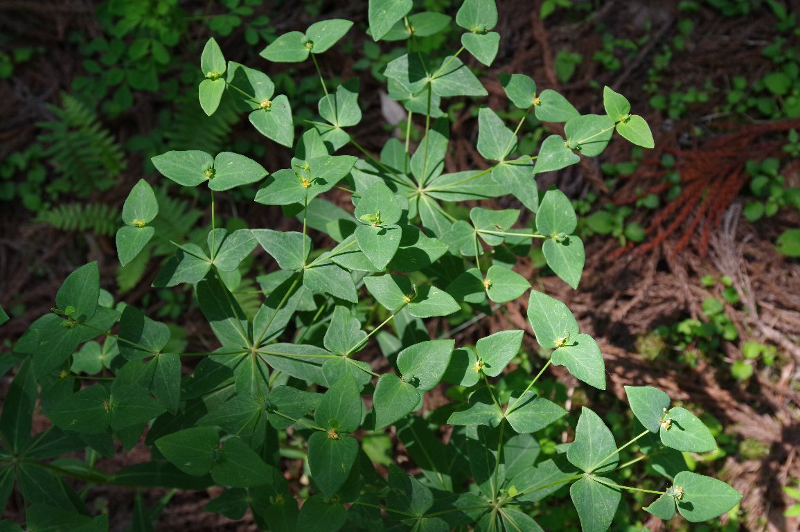 林の下で、一風変わった花を見つけた。ナツトウダイだ。 木漏れ日を受けているその花は、咲いているのか、いないのか、わからないような小さな花だった。 |