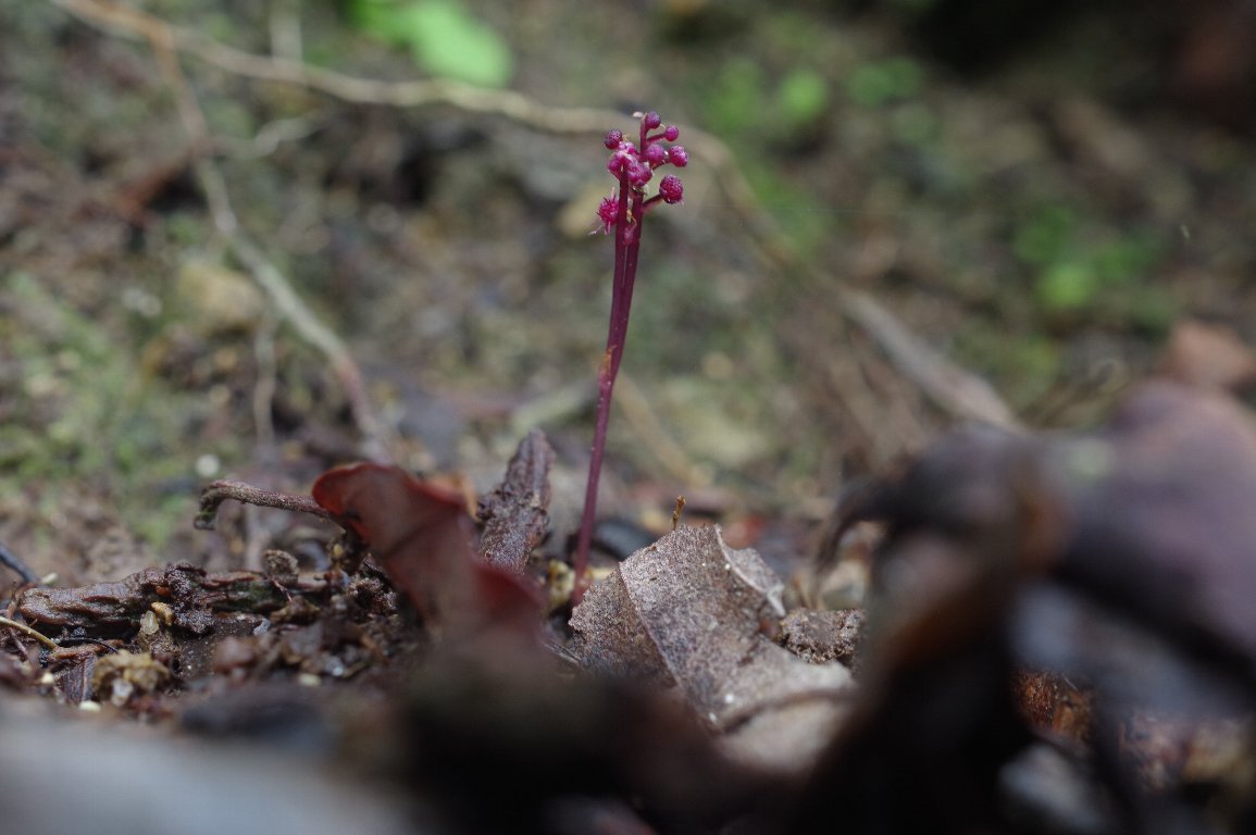 あった!ついに見つけた!小さい! ヒナノシャクジョウの近くの地面を舐めるように見まわした先に、ザクロ色したホンゴウソウの 姿があった。 |