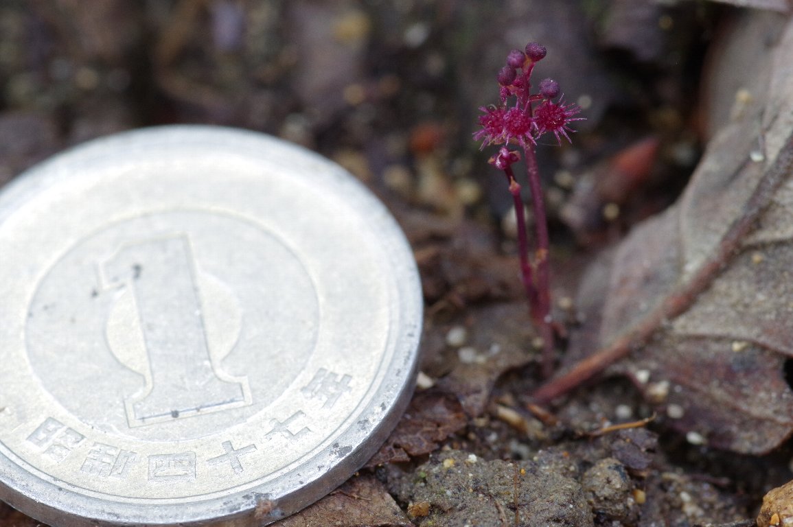 撮影雑記: ホンゴウソウの自生があると知って、探しに行ったのが、2021年の夏。 ヒナノシャクジョウのそばに出ているはずなのですが、この時は見つけられませんでした。 翌、2022年の夏。 再び、ホンゴウソウ探索。 2021年に探したところには、やはり見つけられず、少し離れたところのヒナノシャクジョウが咲く 土手を舐めるように見てゆくと…! あった、ありました! 2年越しで、やっと見つけることができました。 ![]() 枯れたひげ根かと思うような姿ですが、透明感のあるザクロ色に染まった草姿は、まごうことなき ホンゴウソウです。 ![]() しかし…小さいですね。高さ1.5cmあるかないか。 一円玉を置いてみましたが、小ささが際立ちます。 ホンゴウソウは、ヒナノシャクジョウと一緒に咲いていることが多いそうです。 どちらも腐生植物なので、同じような環境を好むのでしょうか。 ここも、そうでした。 ヒナノシャクジョウの姿は、こちら。 → <2021年08月>(立秋) こちらもかなり小さいので、見つけづらいのですが、真っ白な姿のおかげで、咲いていそうな場所を じっくり探すと、なんとか見つけられます。 しかし、ホンゴウソウは、単体で咲いていても、ほとんど見つけることはできないでしょう。 もし、運よく、ヒナノシャクジョウを見つけたら、そばにホンゴウソウも咲いていないか、ぜひ、 探してみてください。 |