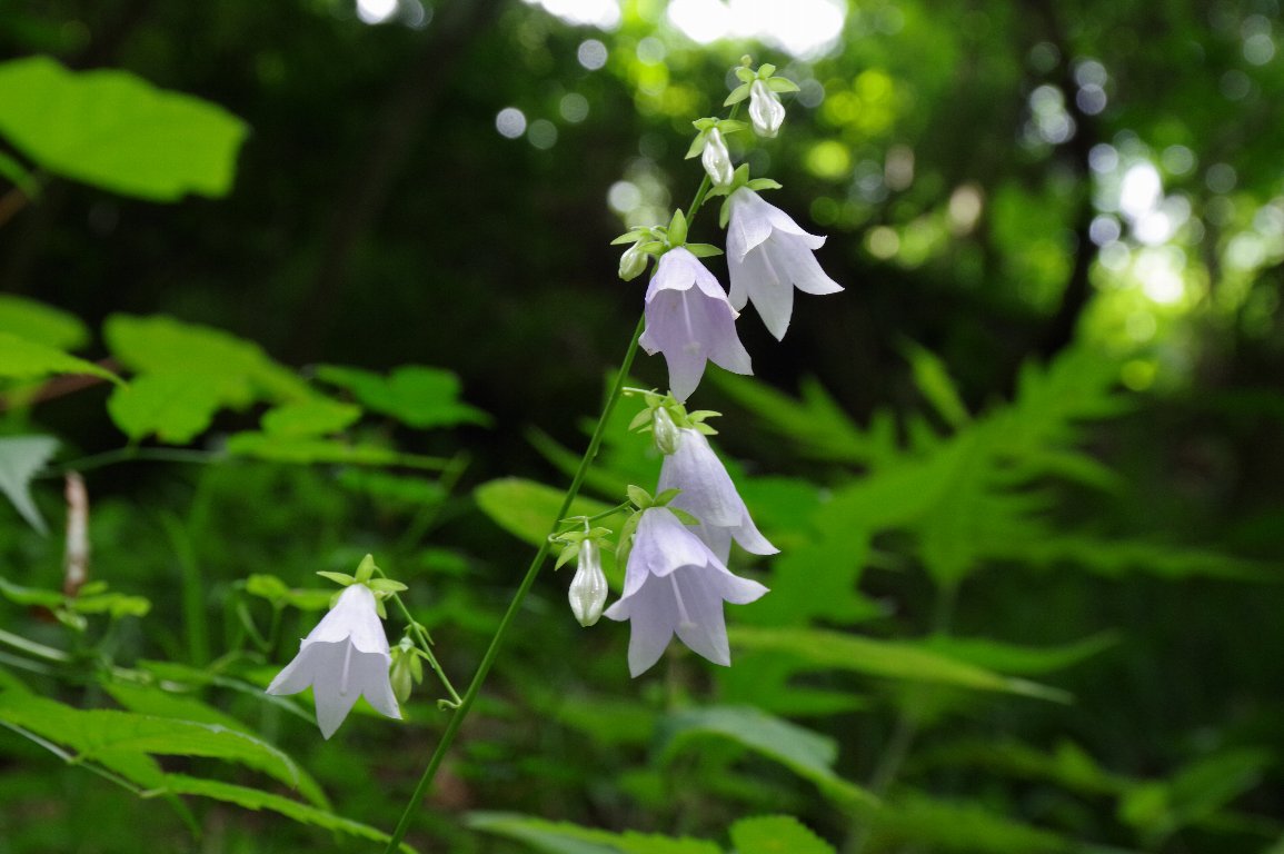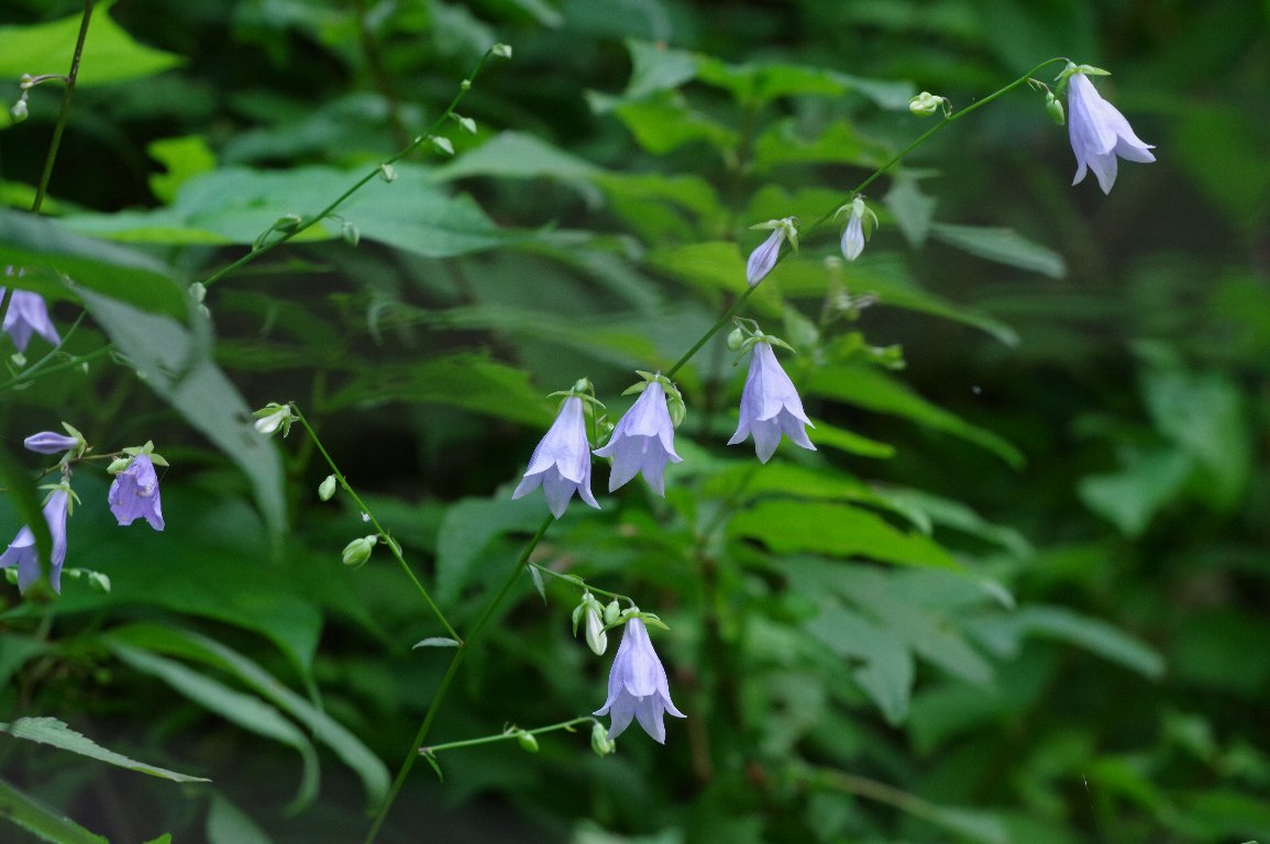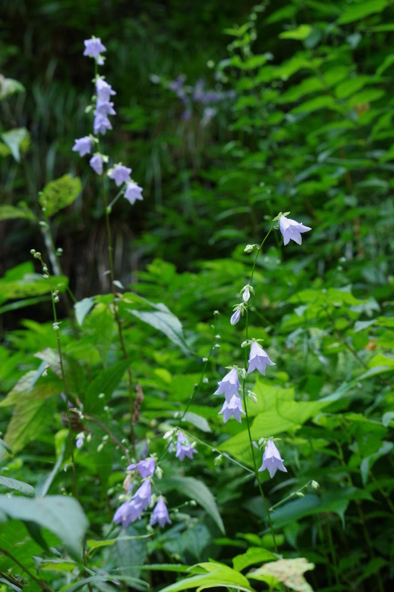 渓谷の斜面に、鈴のような青紫色の花が咲いていた。ソバナの花だ。 早く出たので、まだ、朝の時間帯。吹く風も、見た目も、涼し気な気分を味わえた。 |