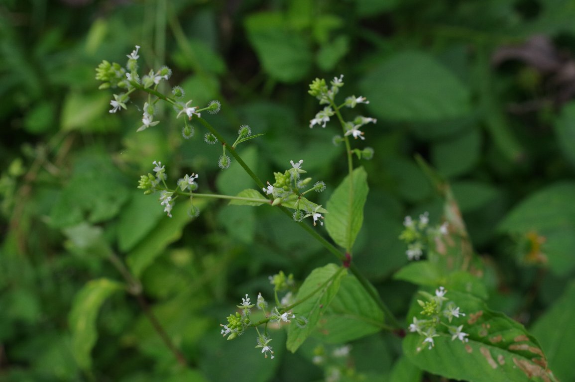 ウバユリが咲いているやぶに分け入ってゆくと、足もとに、水滴をまとったような、ミズタマソウの花が